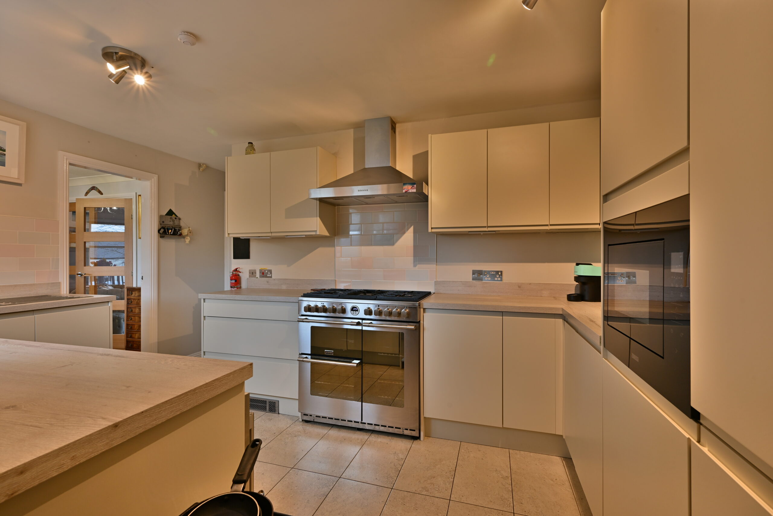 The entrance vestibule has a cloakroom wc and entry to the reception hallway with a stair to the upper floor. The spacious lounge has a front facing widow, oak flooring and twin glazed doors to the dining room. The kitchen features stylish modern fitted furniture with contrasting worktops and integrated appliances including a stainless steel range cooker, cooker hood, microwave, wine chiller, fridge freezer, dishwasher and washing machine. There is a rear hall with access to the rear garden.