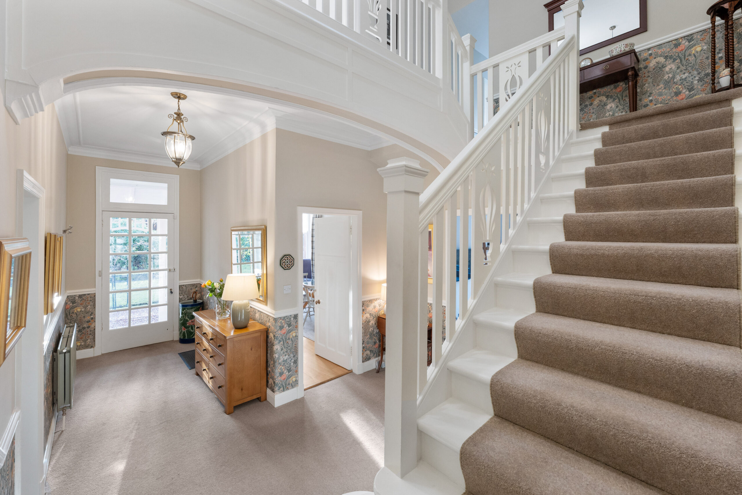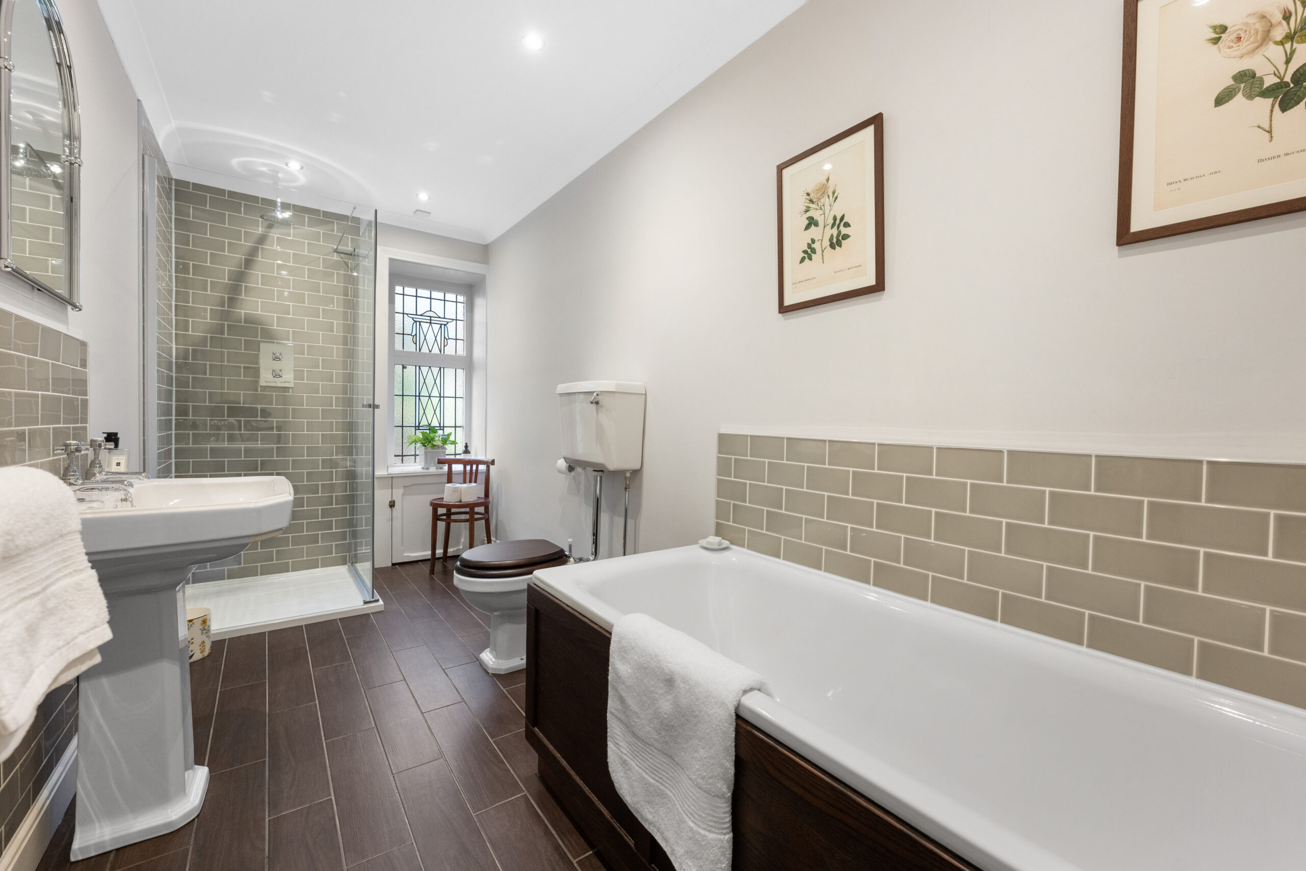 The original staircase with a beautiful timber balustrade leads to a galleried first floor landing revealing four versatile bedrooms and a sleek shower room with twin sinks. The principal bedroom is of particular note featuring bespoke wardrobes and the same shaped corner bay window as the living room below. A ceiling hatch at first floor gives access into a sizeable attic void.