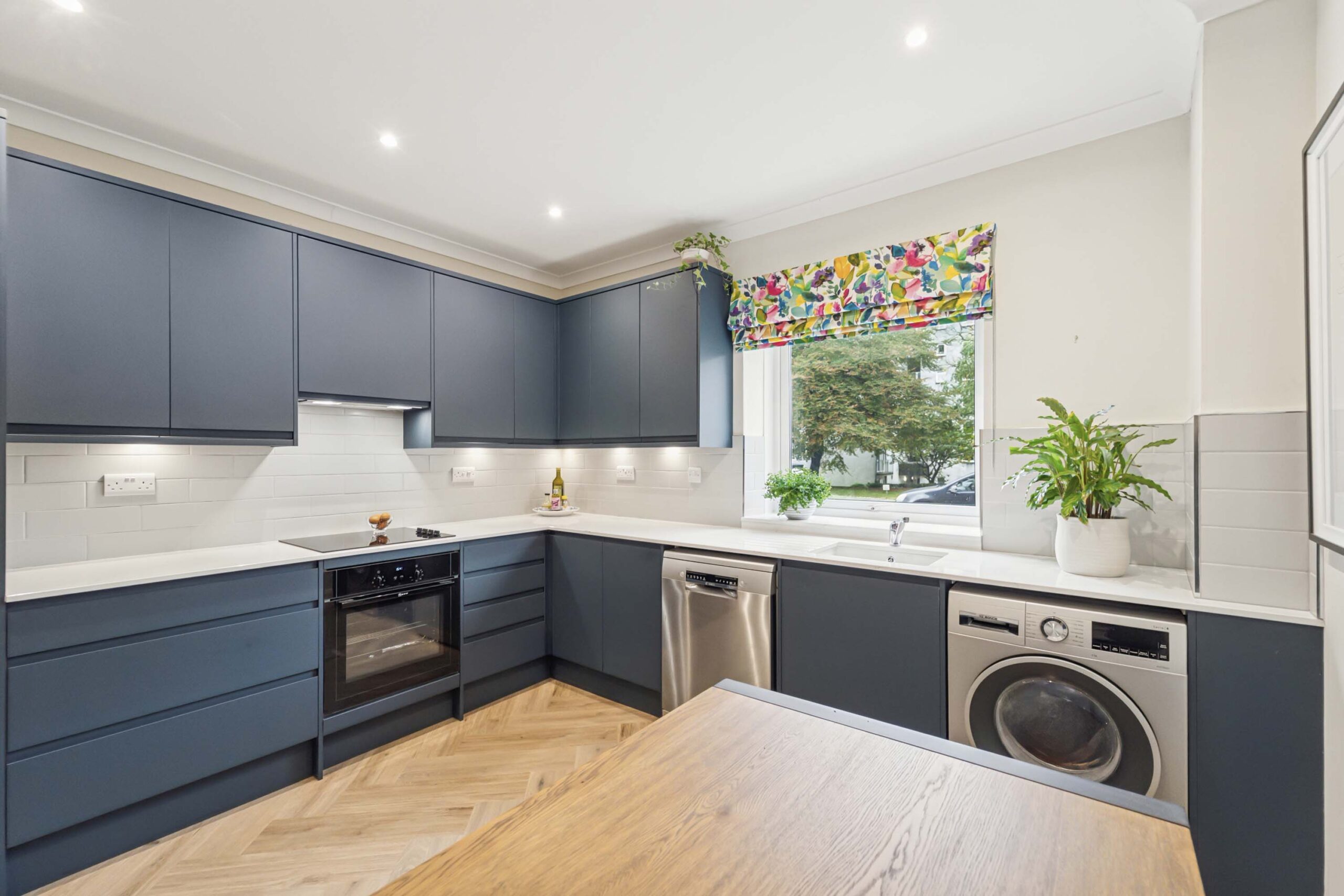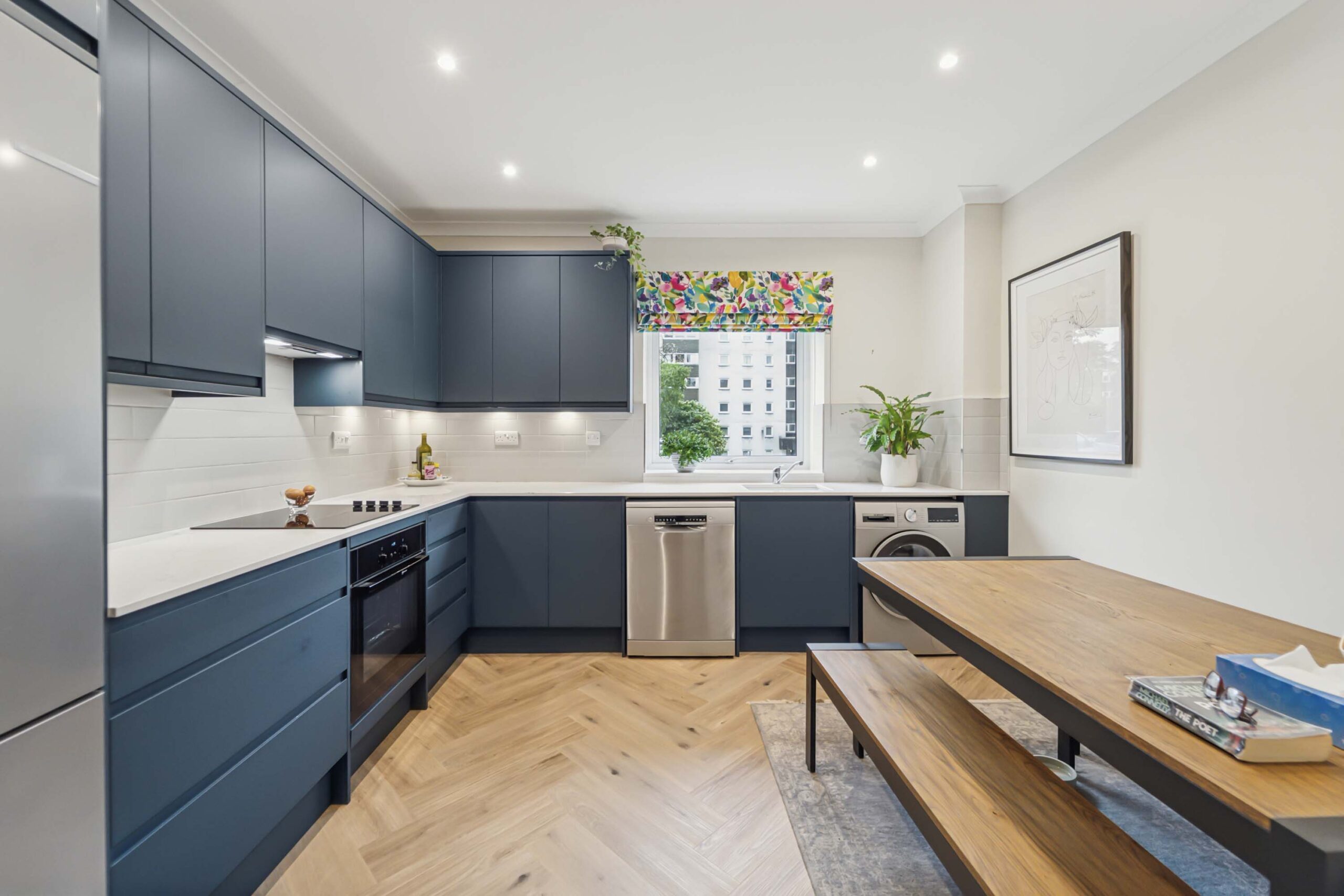 Internally, the accommodation opens to an impressive and welcoming reception hallway, with excellent storage off. The expansive dual aspect lounge is beautifully proportioned and filled with natural light from broad windows and patio doors leading to a private terrace. The re-fitted dining sized kitchen is a highlight, with a sleek, handless design, featuring integrated hob and oven and high-quality worktops.
