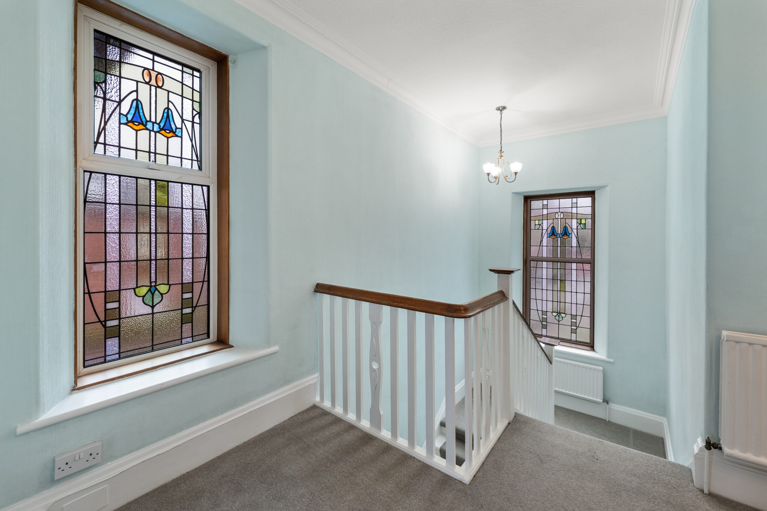 A broad staircase leads to a bright upper landing with useful storage, giving access to four well-proportioned bedrooms and a stylish family bathroom. Additional storage is provided by attic space. The home benefits from gas central heating, double glazing, feature stained glass, security alarm system and tasteful décor throughout.