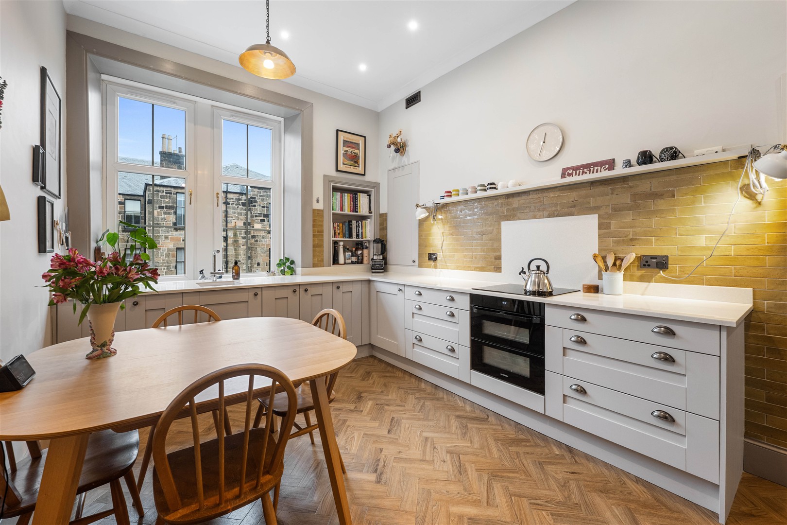 The building is entered via a secure entry system to an immaculately maintained communal hall area, which in turn provides access to the communal rear gardens. Internally, the property comprises of an entrance vestibule, and a large welcoming reception hallway with large built-in storage off. There is a stunning bay windowed lounge to the front with beautiful original features, log burning stove, striking open views down Polwarth Street and great sized storage cupboard off, which alternatively can be used as a home office. To the rear, you will find a bright and spacious dining sized Shaker kitchen, which was fitted in 2021, accompanied with customised, seamless Hanex worktops, a range of base and wall mounted units, open shelving and ample space for dining. There are two spacious double bedrooms, both offering built-in storage, and the principal to the front further boasts great views, lovely cornicing and grand proportions. To complete the internal accommodation on offer, there is a well-appointed family bathroom with three-piece suite and shower over bath.