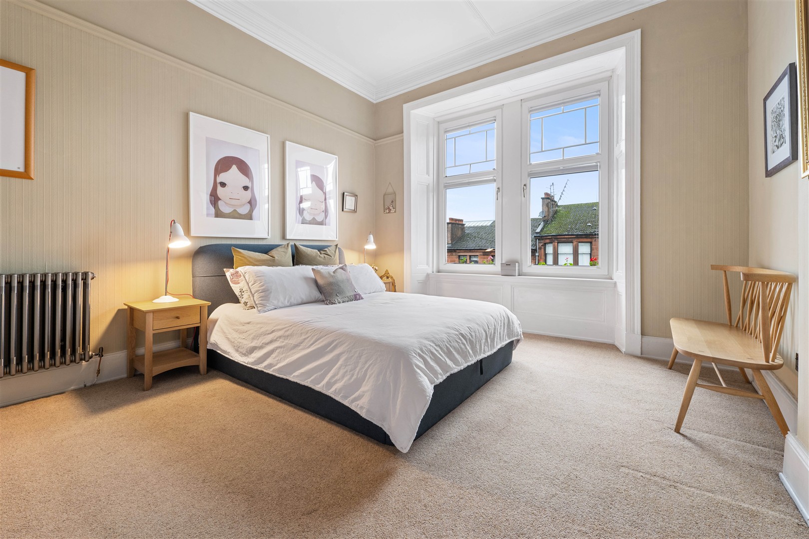 3/1 59 Polwarth Street is a wonderful two-bedroom, third floor traditional red sandstone tenement flat, situated in the highly sought after Hyndland area. The property has been beautifully upgraded and well-maintained by the current owners, and boasts a plethora of period features throughout including architraves, beautiful cornicing, and mosaic flooring in the vestibule. It further benefits from striking stained glass windows throughout, which have been installed by Phil Melville, an award-winning craftsman, and bespoke cabinetry by The Glasgow Cabinetmaker Michael Quinn, in both bedrooms and the lounge.
