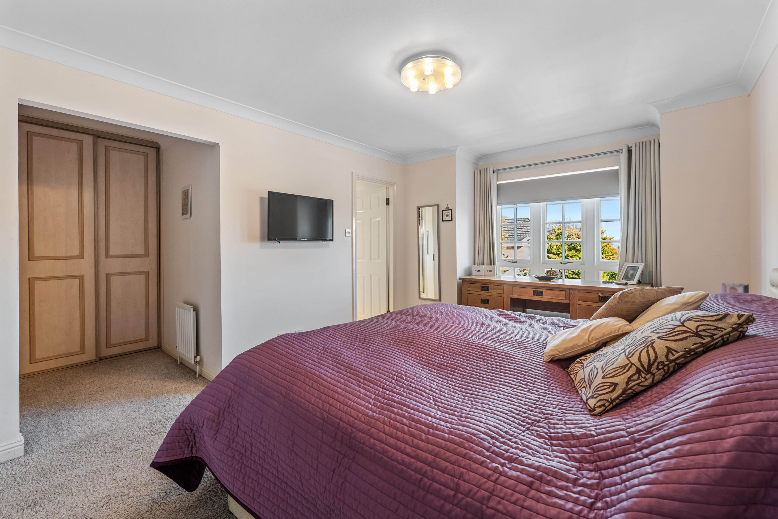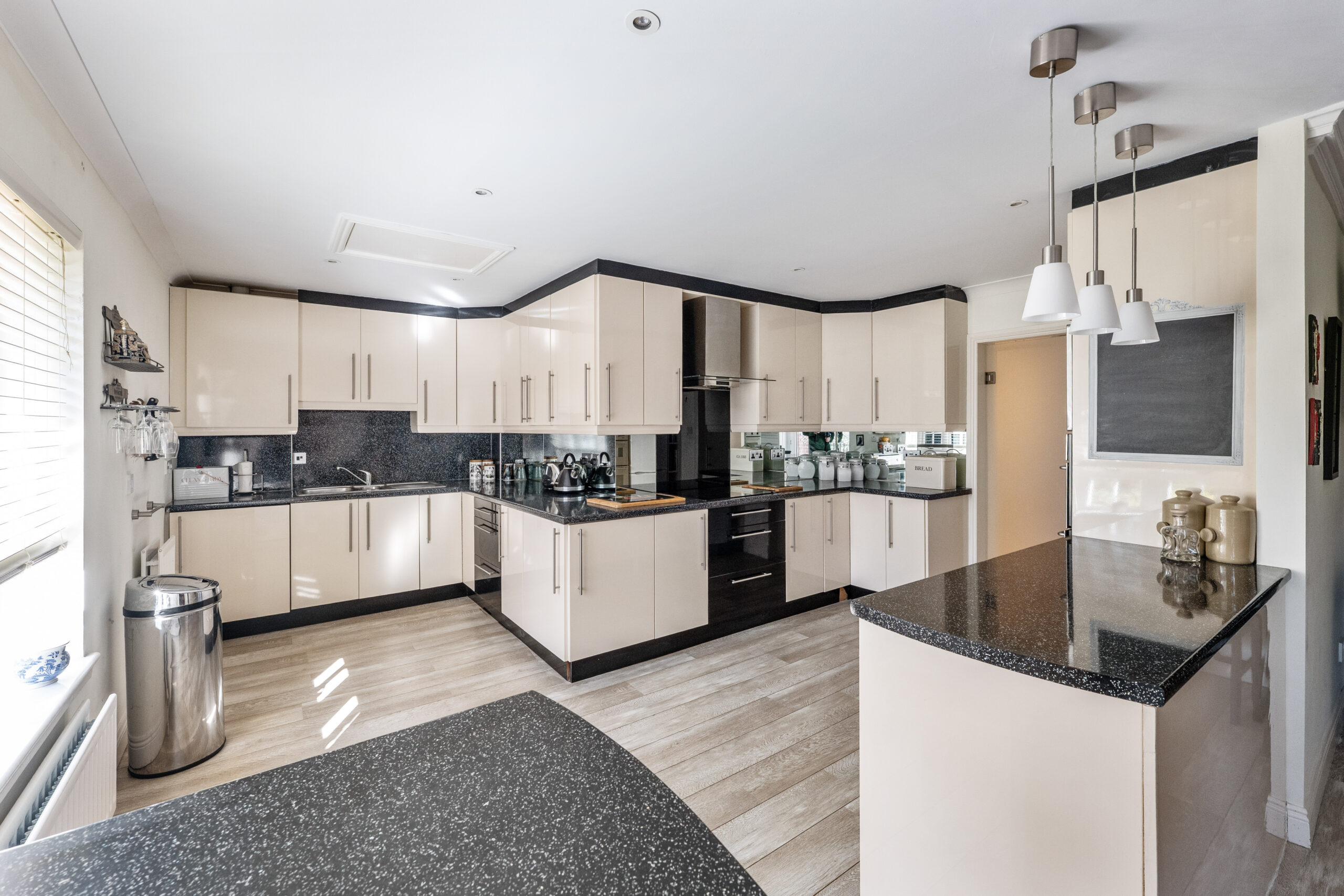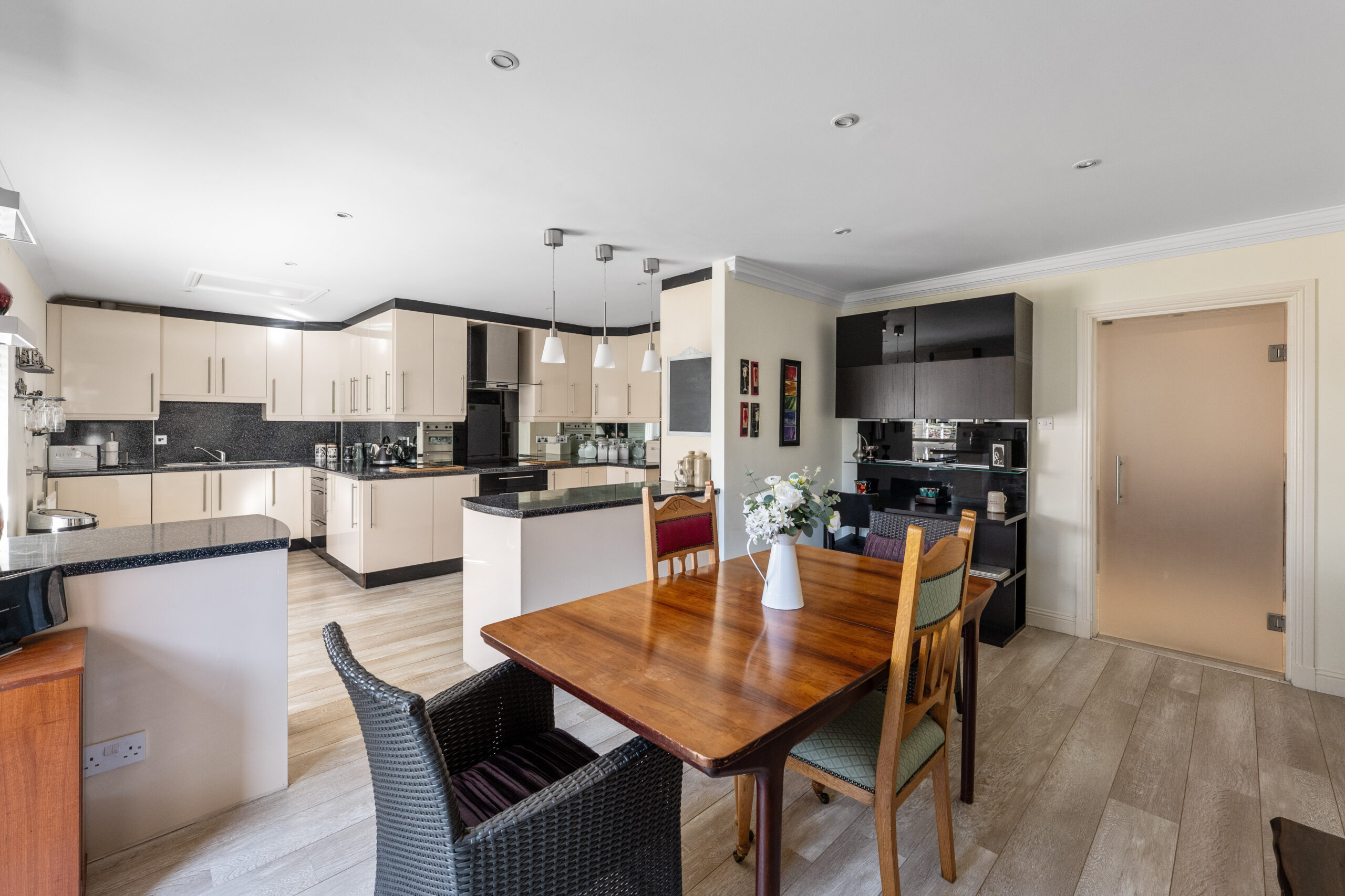 Residents’ entry security system leading to carpeted lobby with the flat on the first floor giving access to very large reception hallway with generous storage provided via three built in storage cupboards, dual aspect rear facing lounge with focal point fireplace and doors onto private south facing balcony, outstanding sized dining/kitchen/family area with doors to balcony and extensive range of modern kitchen units with integrated appliances. The principal bedroom offers walk in closet space with extensive storage and a modern en-suite shower room with full tiling and built in cabinets, two further double bedrooms, both with built in storage and a modern bathroom with full tiling and shower.