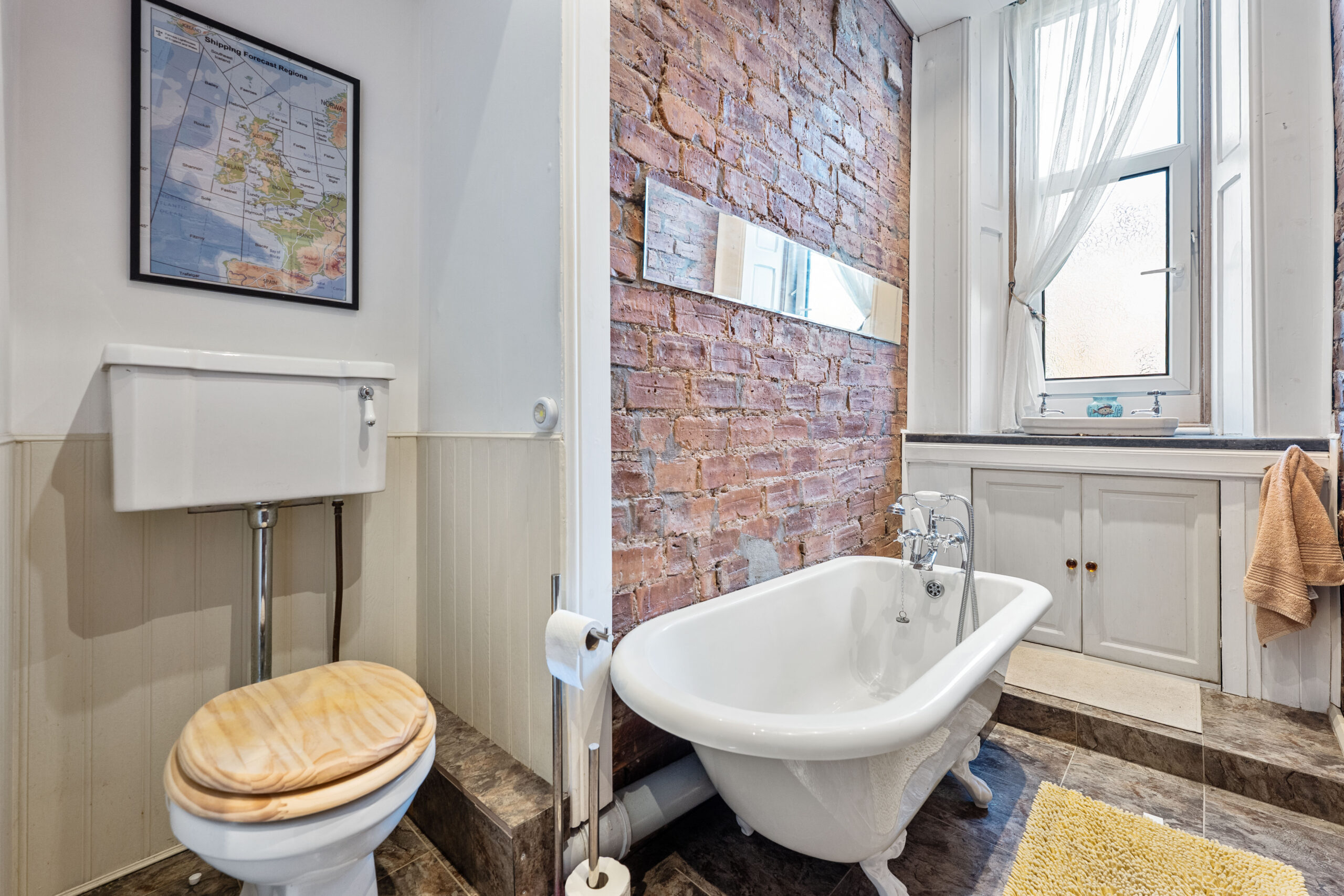 The accommodation in brief; resident’s stairwell to first floor, private vestibule, broad reception hallway with storage adjacent, bay windowed lounge with a real fire, three double sized bedrooms (one with a large fitted wardrobe) and a three piece bathroom featuring a rolltop bathtub and exposed brick walls. The dining kitchen has an abundance of fitted cabinetry, space for table and chairs and a lovely window seat whilst a separate shower room/wc is also accessed from the hallway.