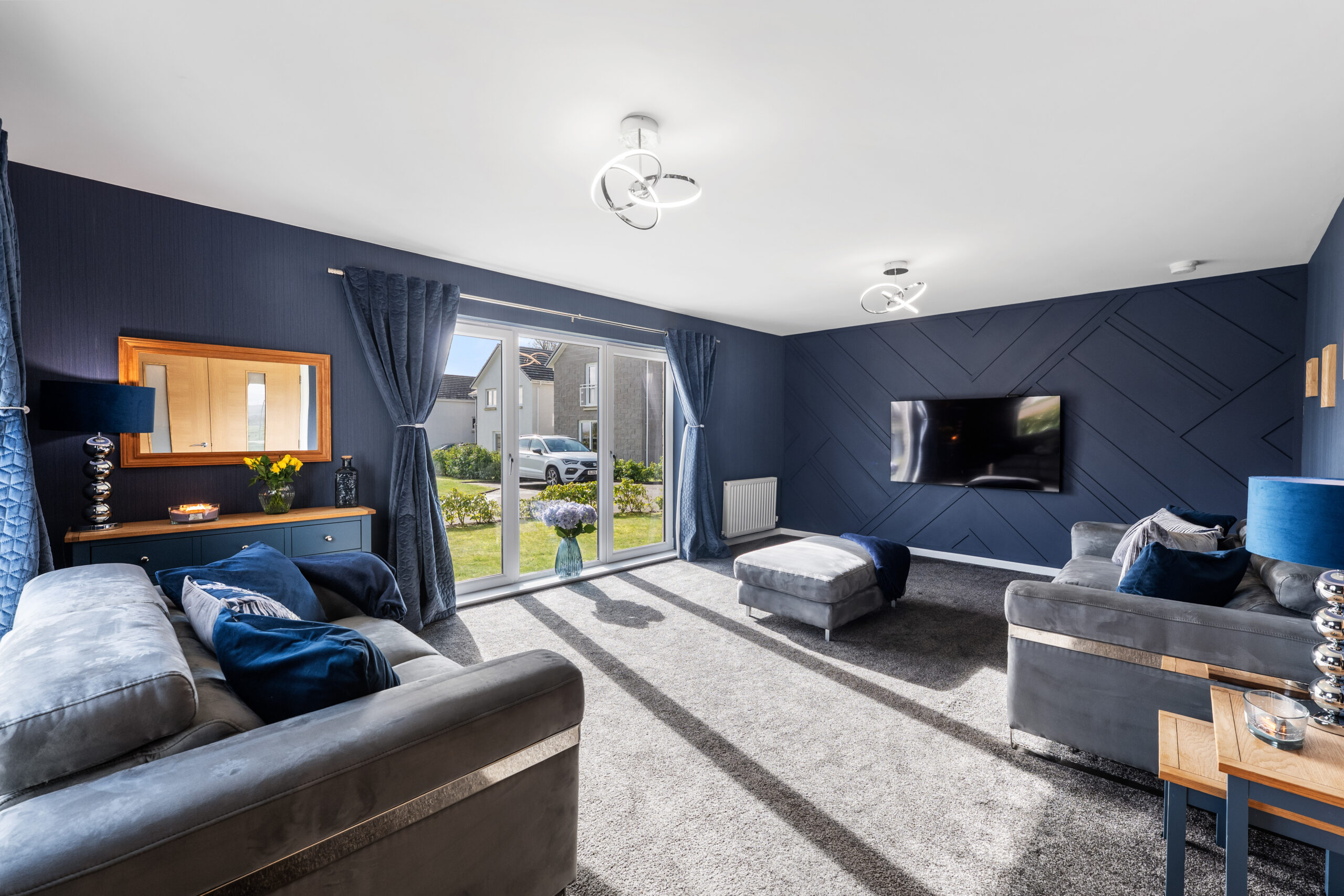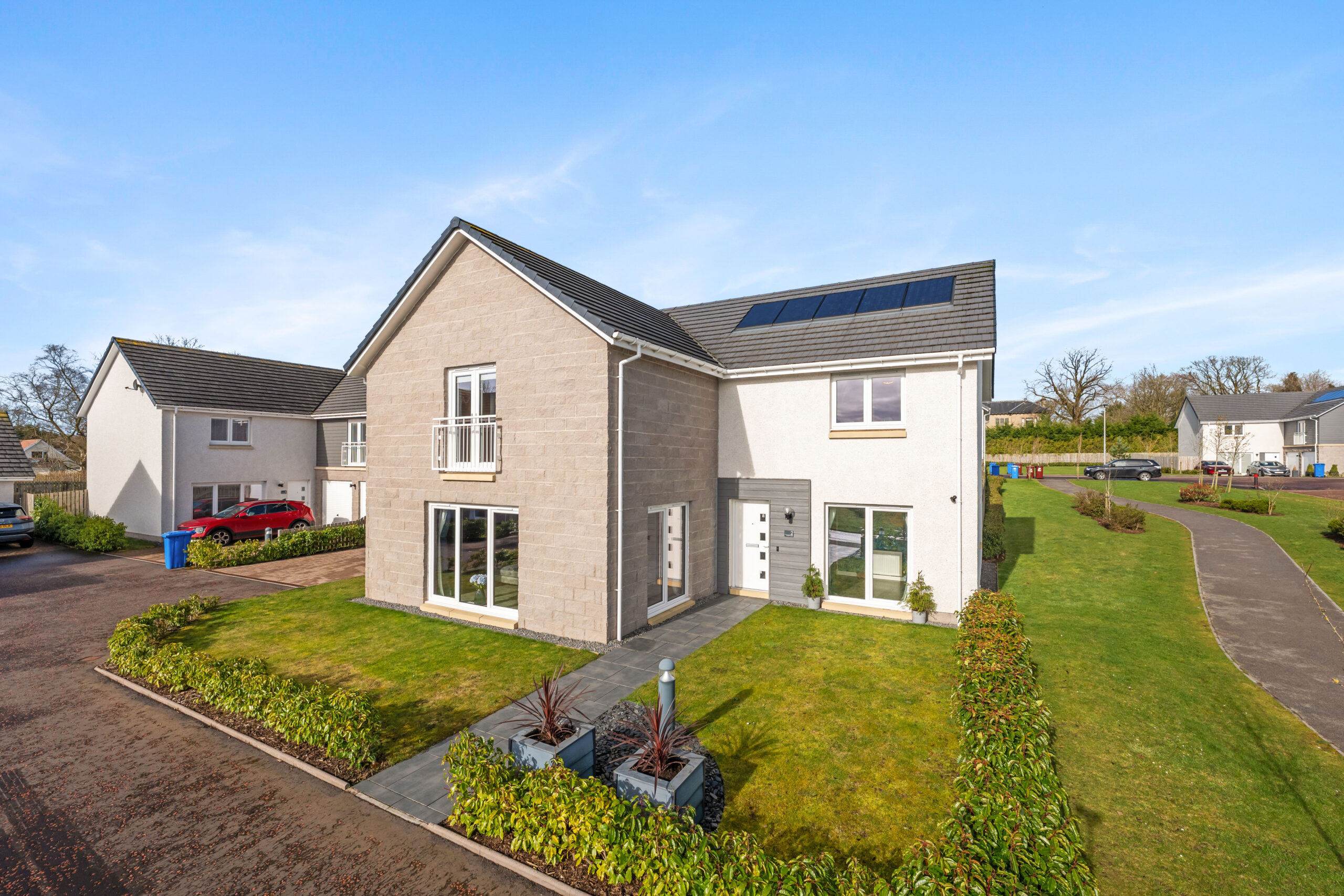 Beautifully designed five/six bedroom family home by Bancon Homes, offering approximately 2,400 sq ft of refined living space within the highly regarded Overton Gardens development in Strathaven. Defined by its sense of space, light, and refined simplicity, this is a home where considered design meets effortless modern living. From the moment of arrival, the atmosphere is one of understated elegance, with beautifully proportioned interiors and a seamless flow throughout.