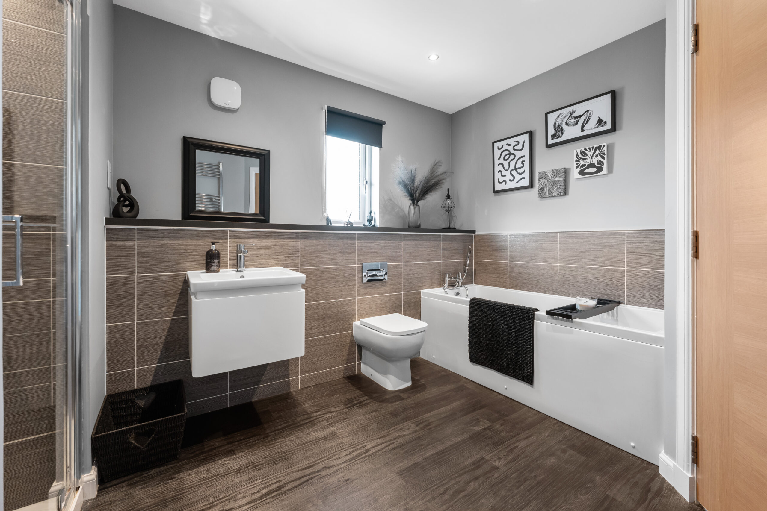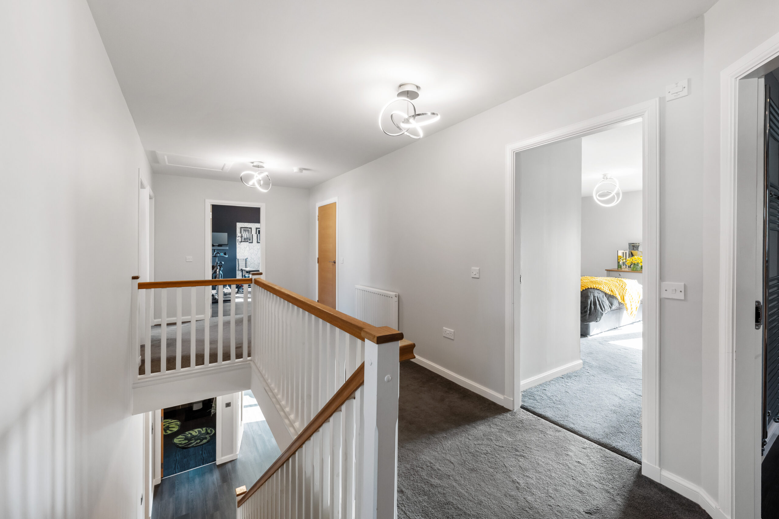 Ascending to the upper level, the principal suite provides a quiet retreat, complete with a spacious walk-in dressing area and a beautifully appointed en-suite. A second bedroom also benefits from its own walk-in wardrobe and en-suite, while three further double bedrooms, all with fitted storage, are served by a stylish family bathroom finished with Porcelanosa tiling.