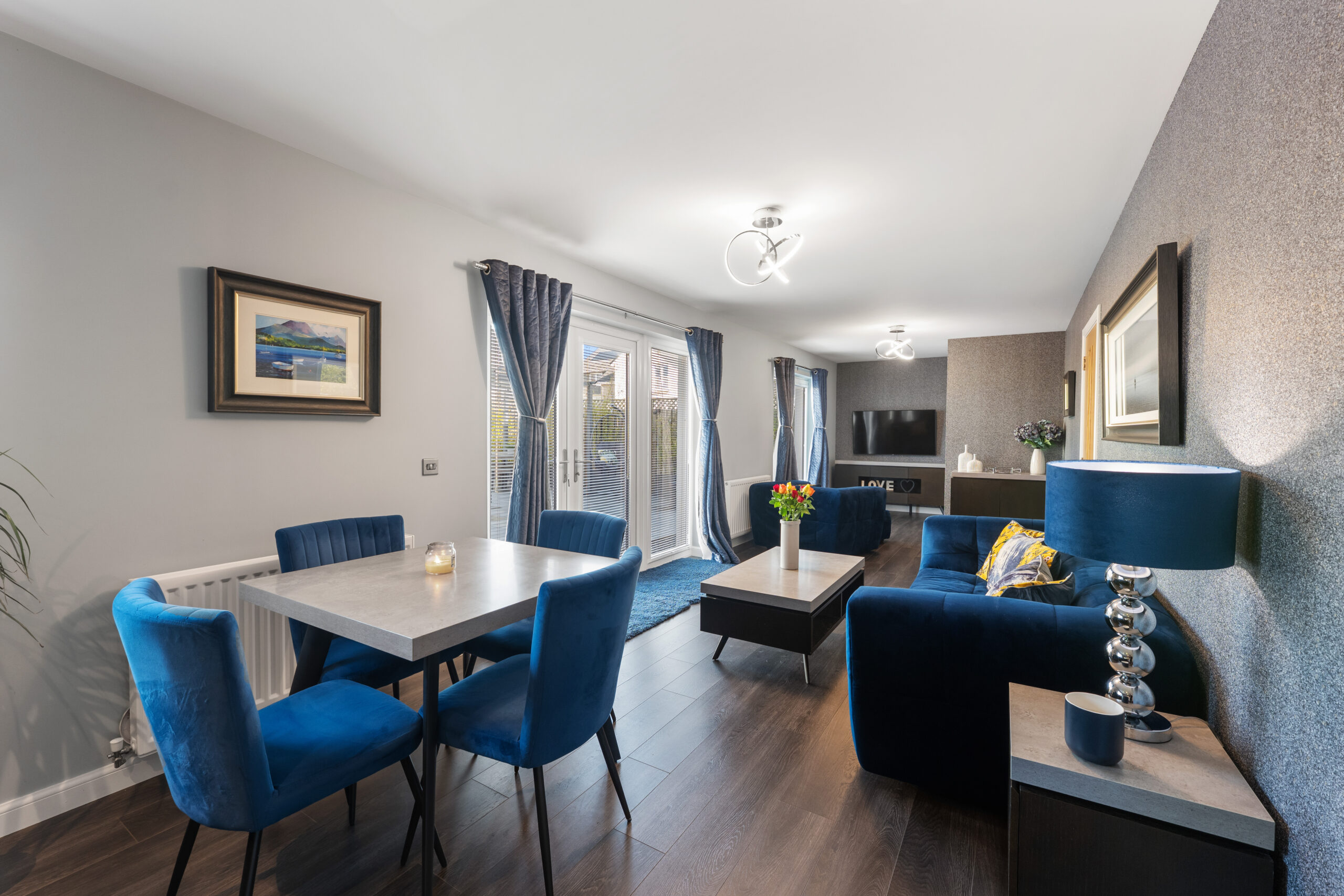 A striking dual-aspect living room offers a calm and sophisticated setting, equally suited to formal entertaining and relaxed day-to-day living. At the heart of the home, an outstanding open-plan kitchen, dining and family space creates a natural focal point - designed for both connection and comfort. The bespoke German designer kitchen is appointed with premium integrated appliances and an elegant breakfast bar, while French doors open onto the landscaped garden, allowing natural light to pour in and extending the living space outdoors.