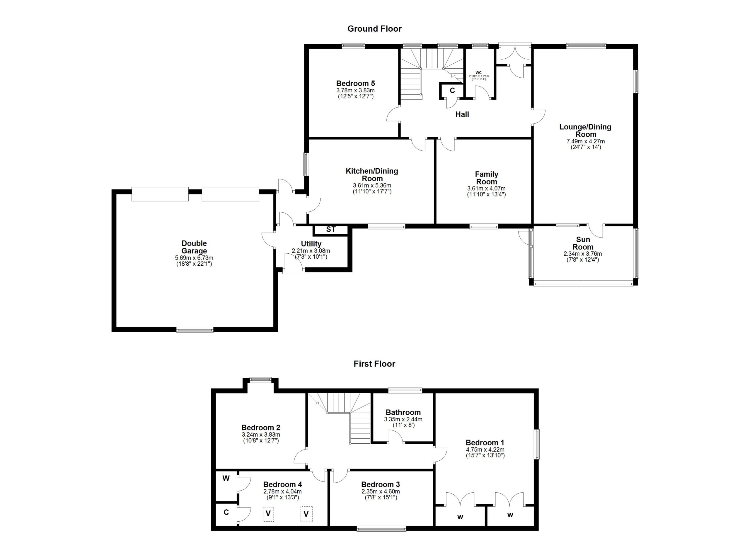 In more detail the accommodation comprises vestibule, reception hall, cloaks/wc, formal lounge/dining room with wood burning stove, sun room, family/tv room, JS Geddes dining kitchen, useful utility with internal access to double garage, five double bedrooms, modern bathroom, new double glazing, gas central heating.