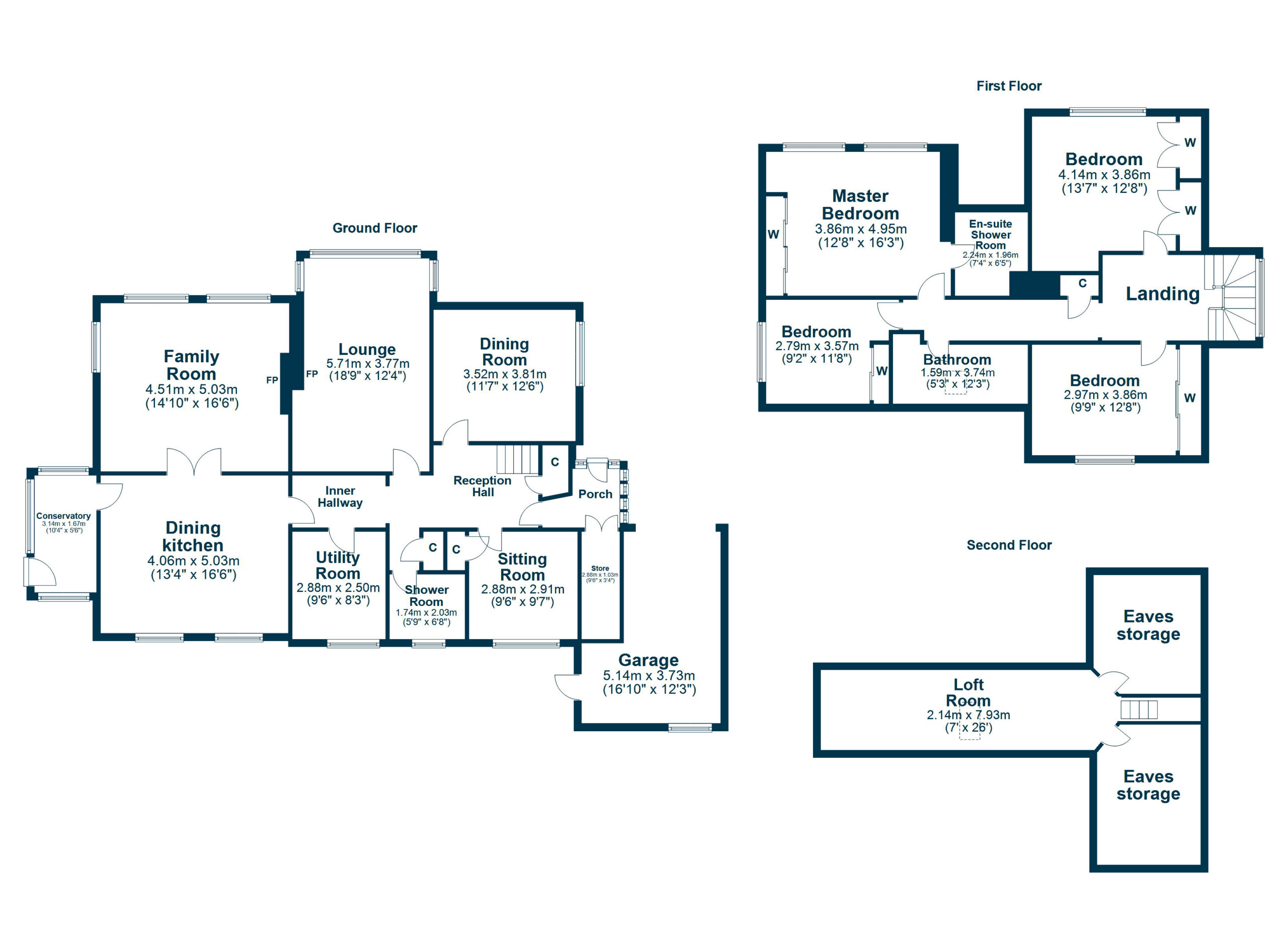 In summary the accommodation extends to, on the ground floor, an entrance porch with walk-in store off, welcoming reception hallway, front facing lounge with feature fireplace, dining room/bedroom 5, sitting room, fitted kitchen with double doors to the family room with feature fireplace, conservatory with door to the side garden, three piece shower room and utility room. Upstairs there are four further bedrooms and a family bathroom with freestanding bath. The master bedroom has a three piece en-suite shower room. From the landing there is a permanent stair to the floored and lined loft room with two eaves storage areas off.
