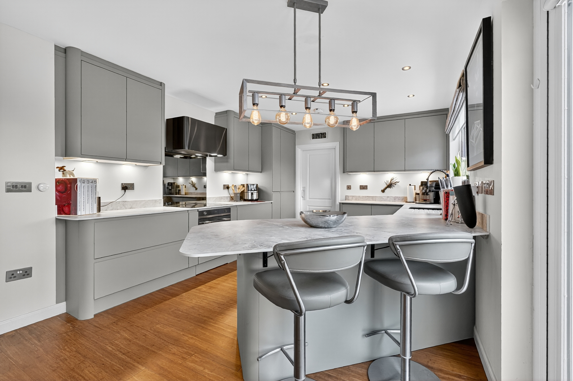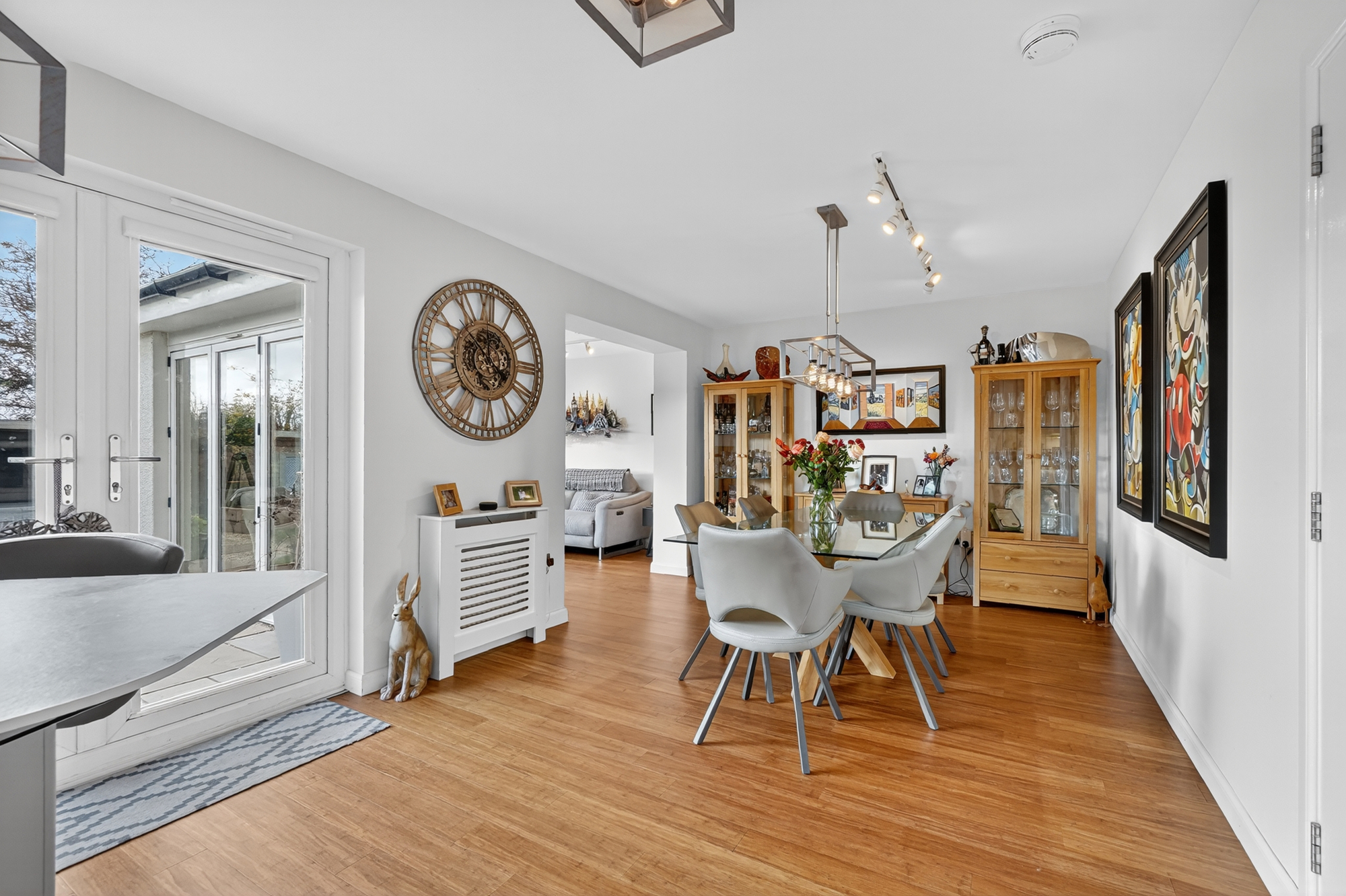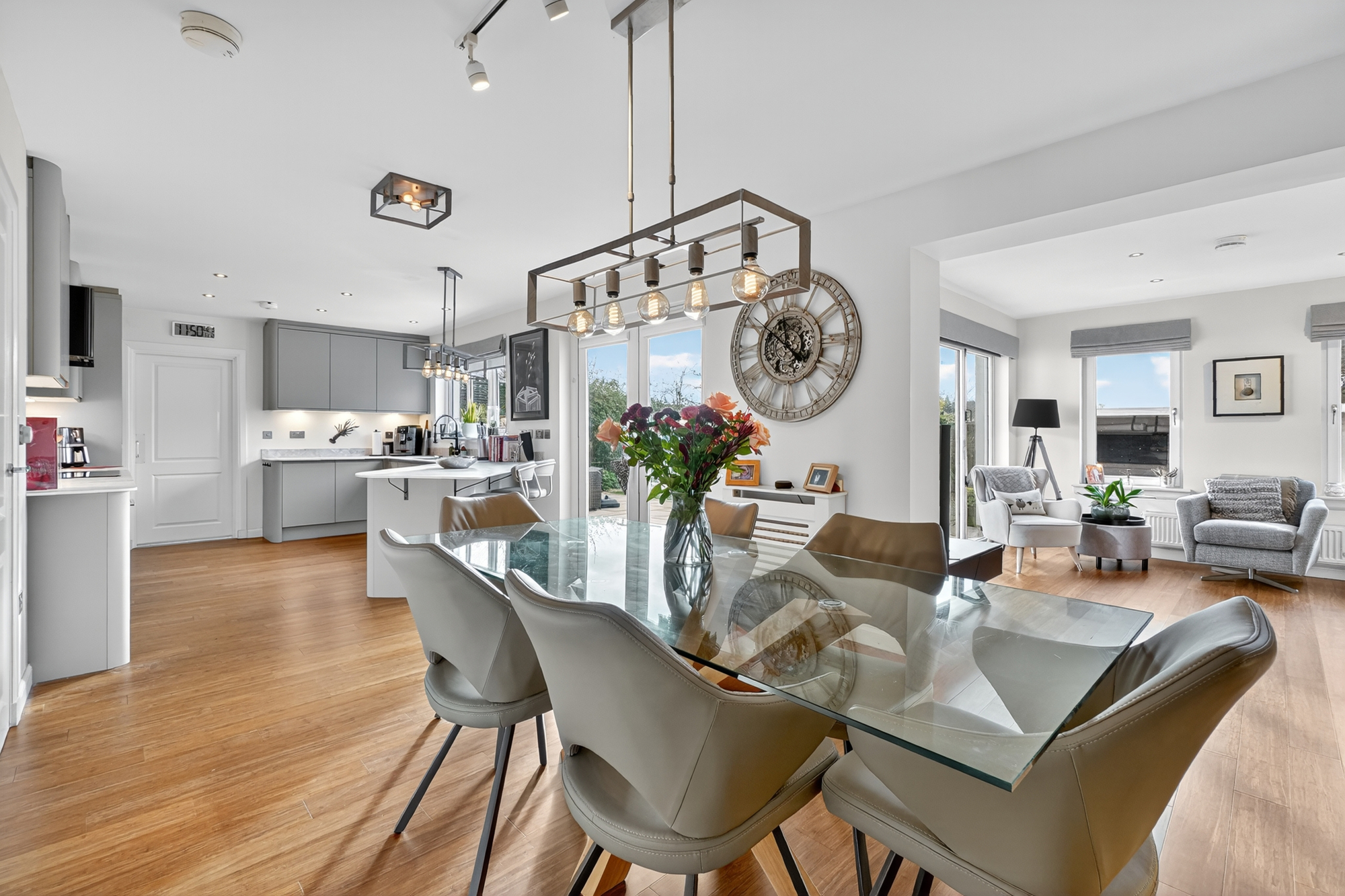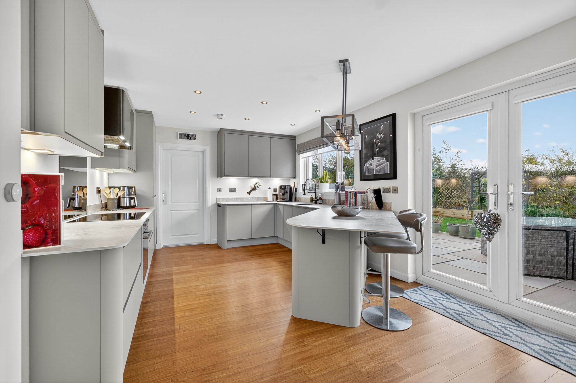 In more detail, the internal accommodation extends to an elegant wood floored entrance hallway with a bright, open layout, stairs to the upper floor and fitted under stairs storage and downstairs WC. Off the hallway is a spacious bay-windowed formal lounge and an impressive bespoke open plan dining kitchen with a large dining area and extended family sitting room. French doors and bifolds lead out to the garden patio. Off the kitchen is a fitted utility room and larder with internal access to the garage and leading to the back door and garden. On the upper floor landing there is a storage cupboard, access to the partially floored loft and a relaxed reading / study area. The stunning master bedroom suite has two Juliet balconies and a large four piece master en suite. There are four further bedrooms, two with fitted wardrobes and one with an en suite shower room. A generous family bathroom suite completes the upper floor accommodation.