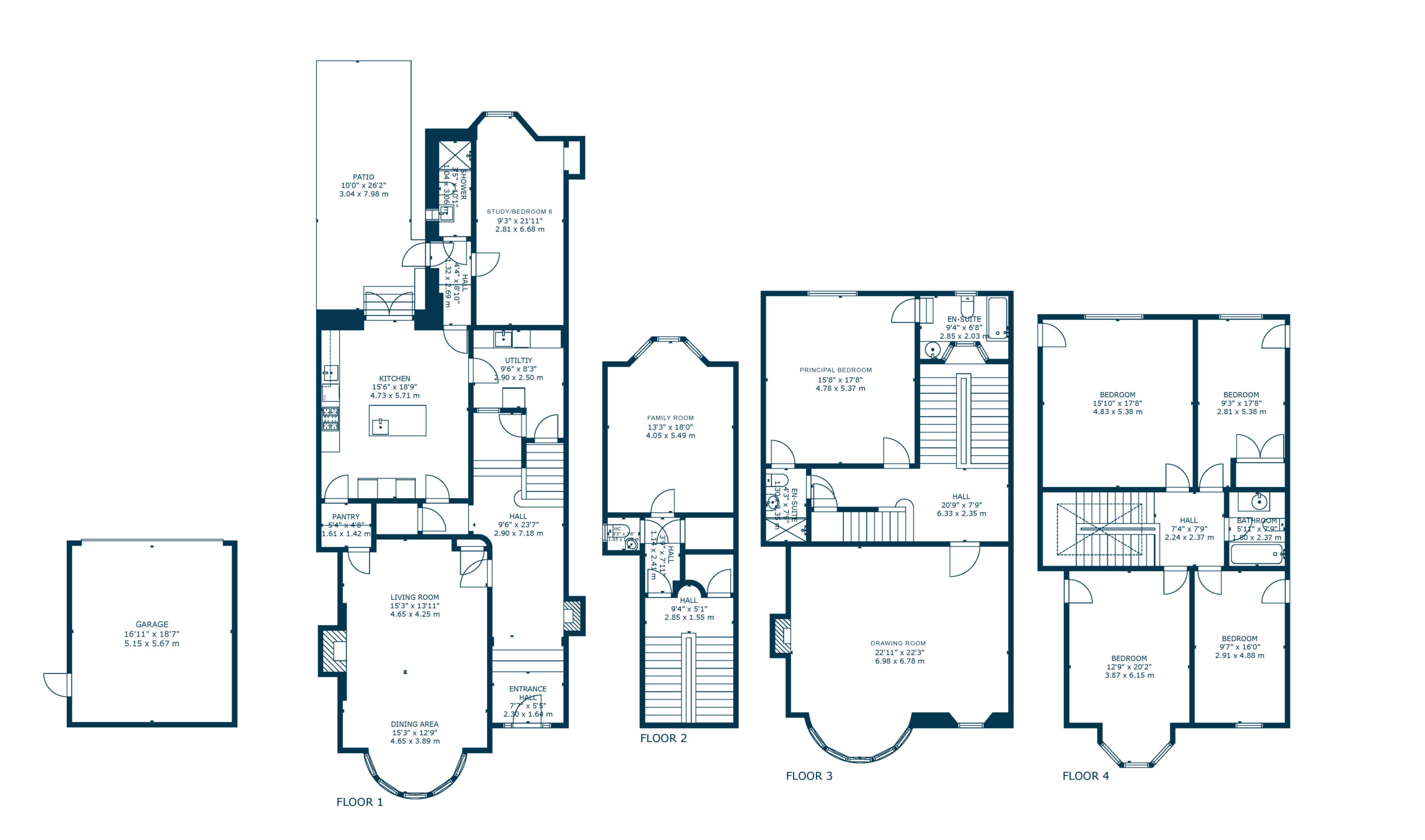 A beautiful staircase leads to a half landing featuring a versatile family room and stylish WC. The first floor hosts a magnificent drawing room and a generously proportioned principal bedroom, complete with modern en suite shower room and separate en suite bathroom with jacuzzi bath. On the top floor, four further bedrooms and a contemporary family bathroom provide ample accommodation for larger families or guests.