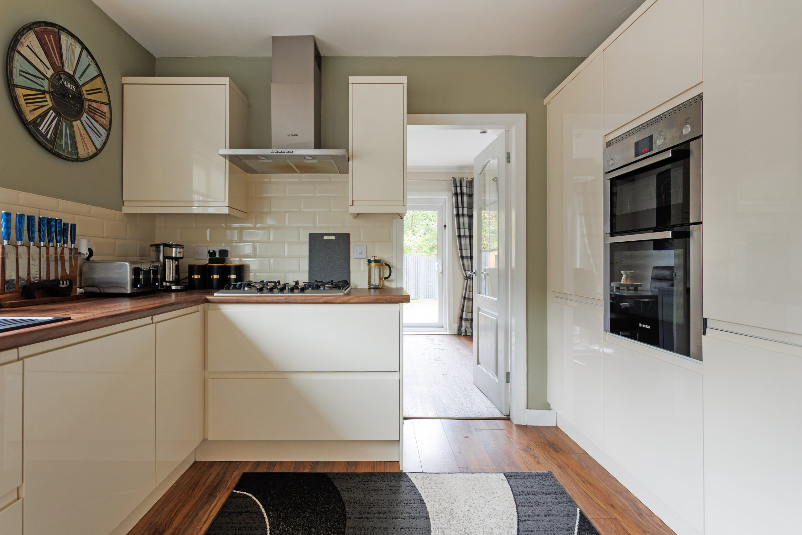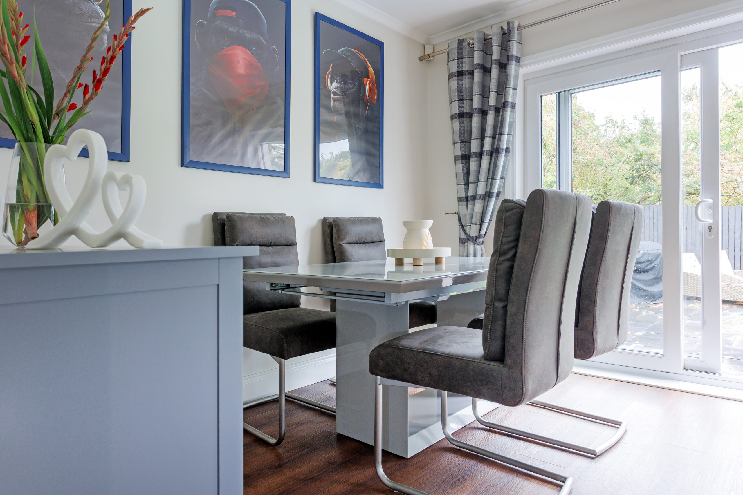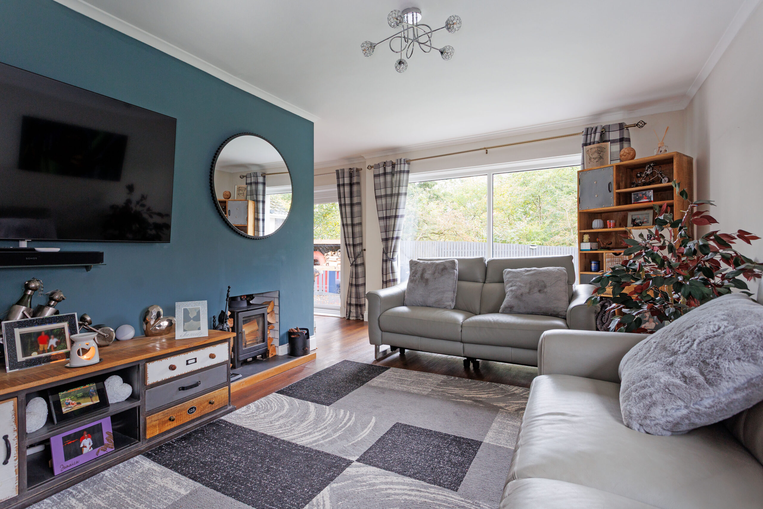 The luxurious interior has three bedrooms, including one with an en suite shower room, and an open plan dining room and lounge that has an incredible almost wall of glass, with a large picture window and sliding patio doors linking to the south-facing rear garden. The gardens have been professionally landscaped, with monoblock parking to the front, a detached garage with light, power and water, and the south facing rear garden has new artificial grass surrounded by mature woodland to generate excellent privacy.