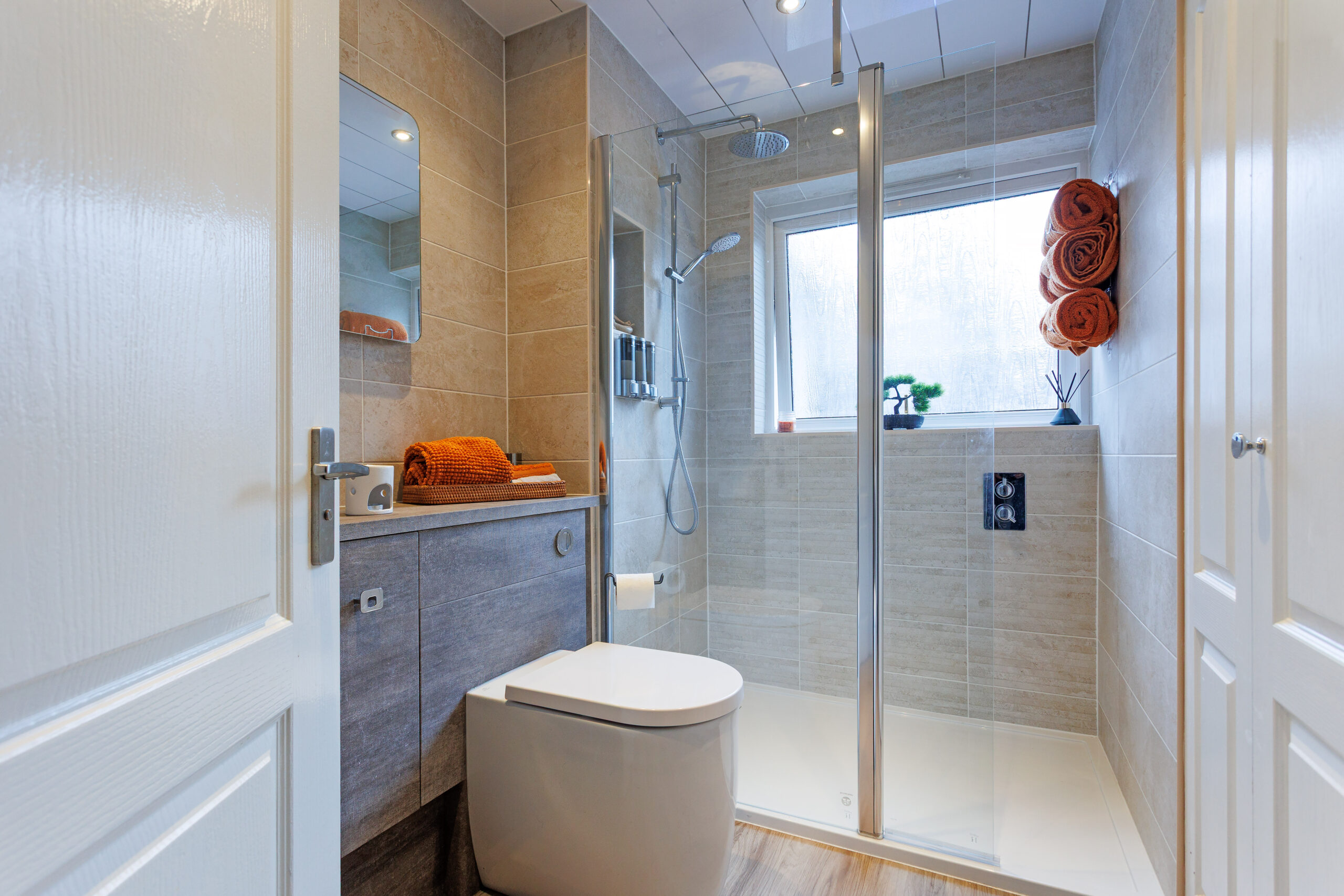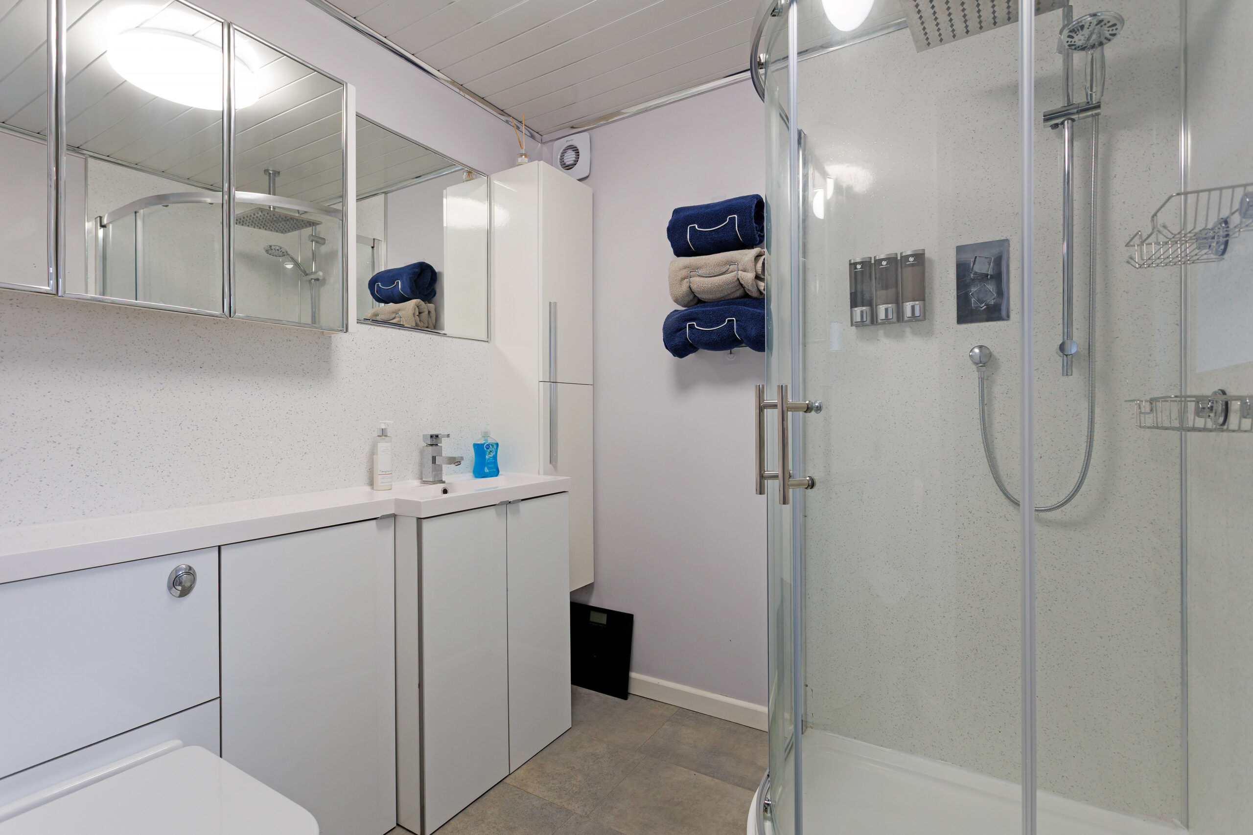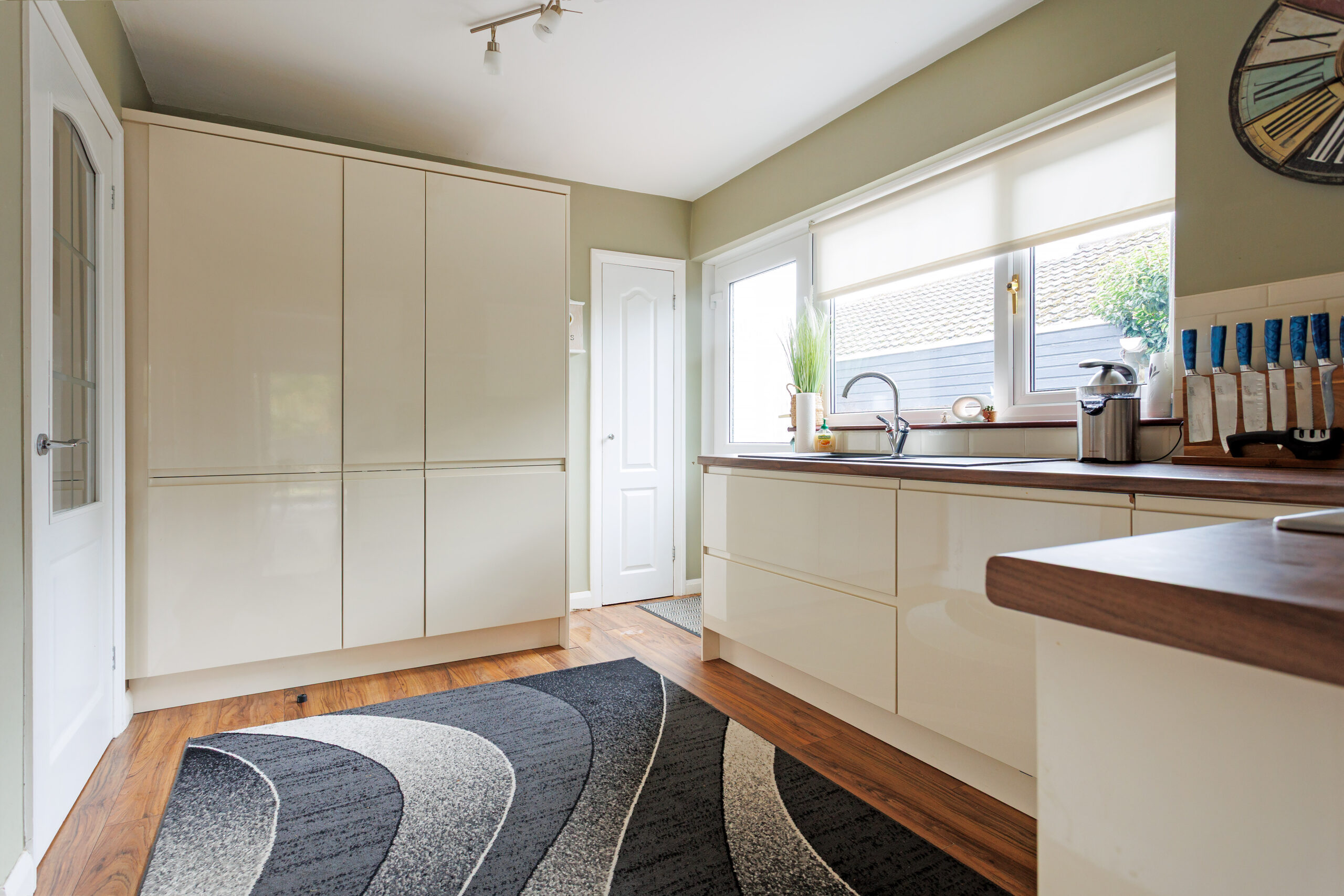 The luxurious interior has three bedrooms, including one with an en suite shower room, and an open plan dining room and lounge that has an incredible almost wall of glass, with a large picture window and sliding patio doors linking to the south-facing rear garden. The gardens have been professionally landscaped, with monoblock parking to the front, a detached garage with light, power and water, and the south facing rear garden has new artificial grass surrounded by mature woodland to generate excellent privacy.