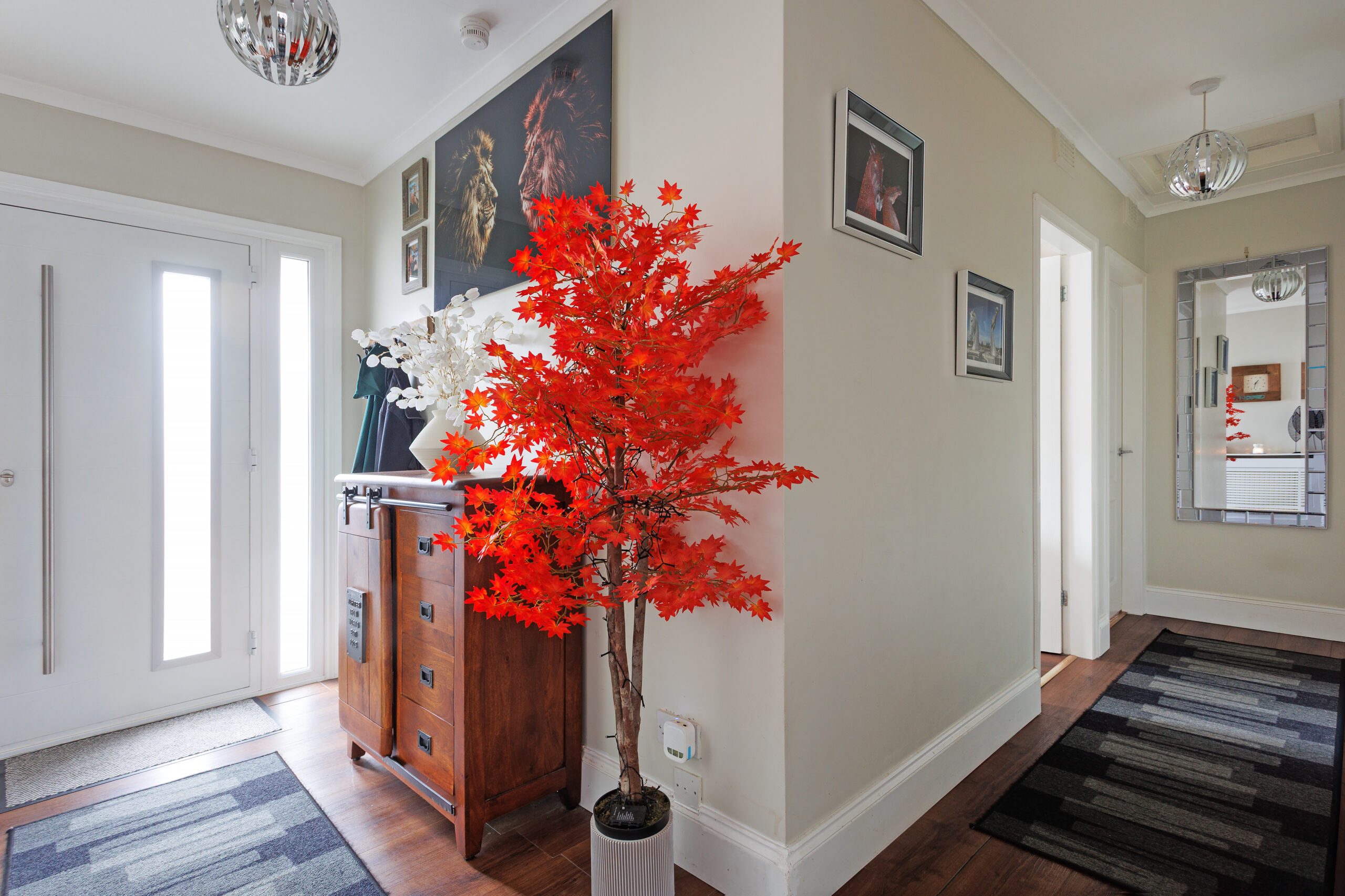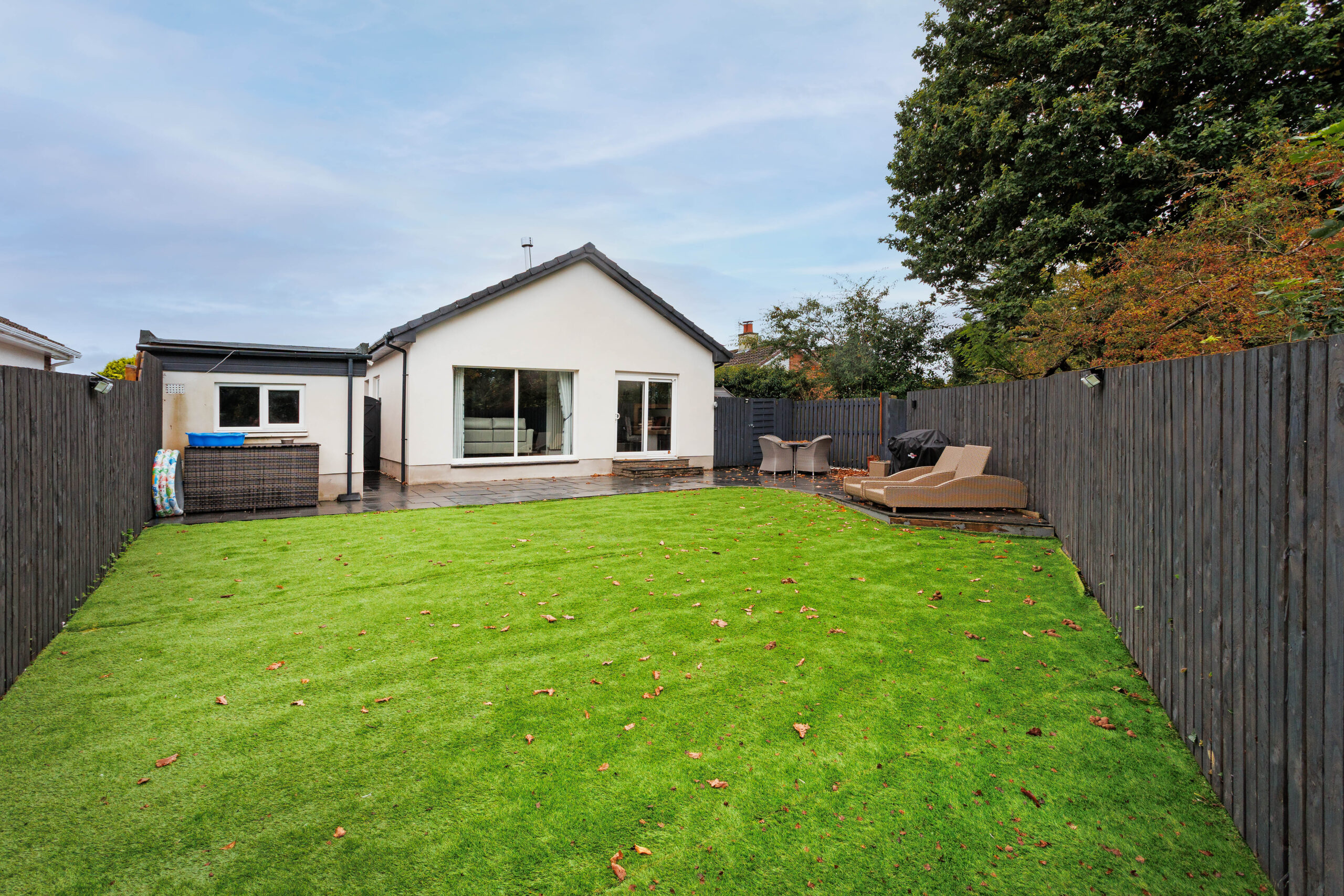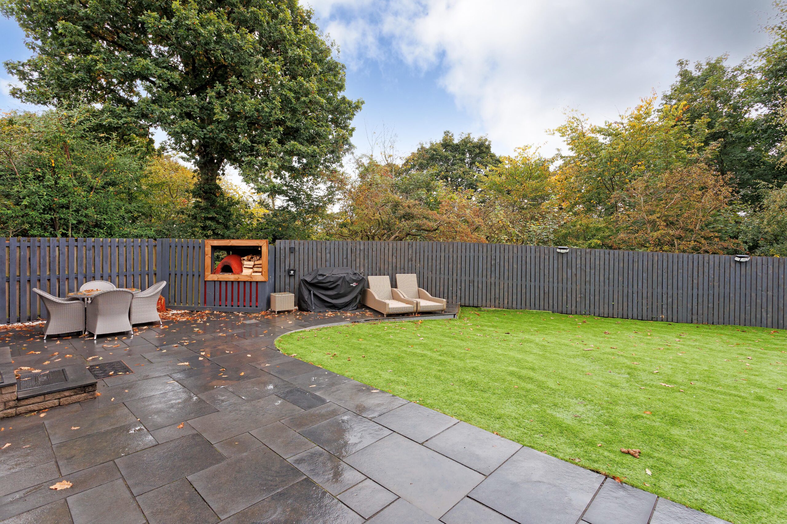 Externally there are gardens to the front with monoblock paving forming two driveways, one leading down the side of the property and separated by a manicured lawn. There is gated access round to a south-facing rear garden, which has new artificial lawn, decorative shrubs, a paved patio area, a garden shed, a built-in outdoor pizza oven and a side door entry into a detached garage, with light, power, and water.