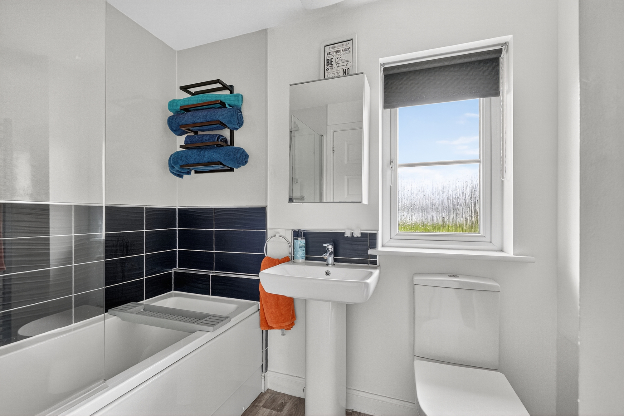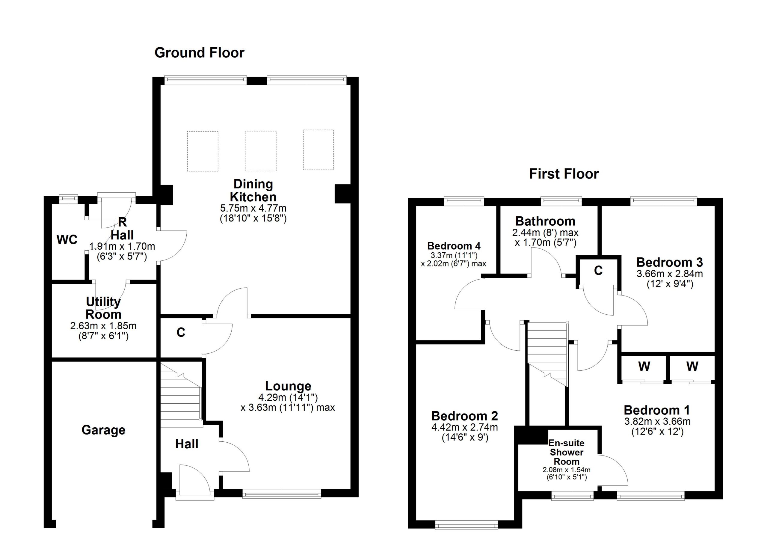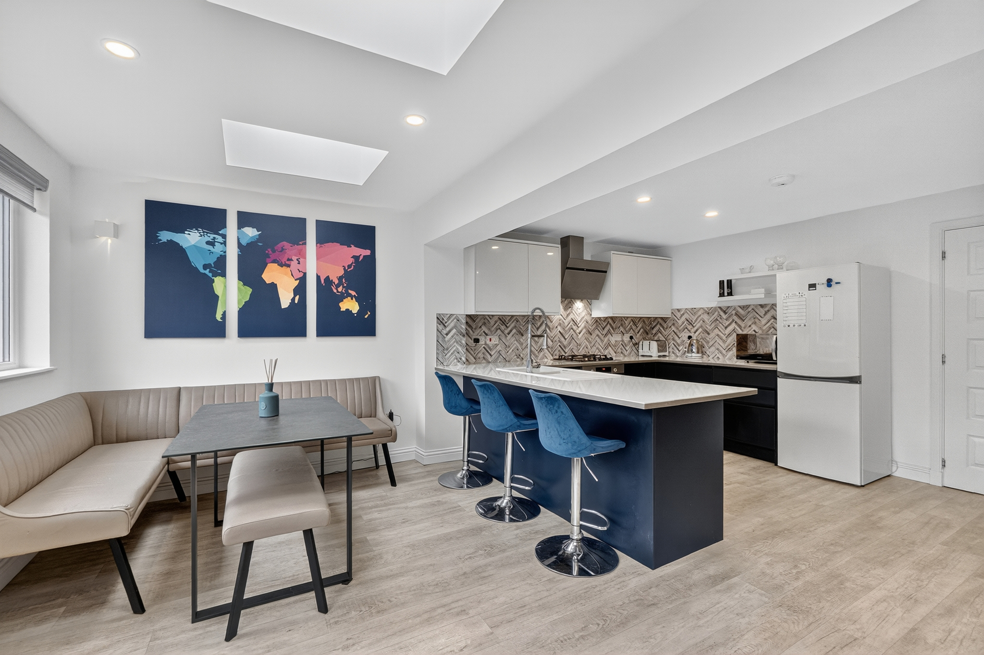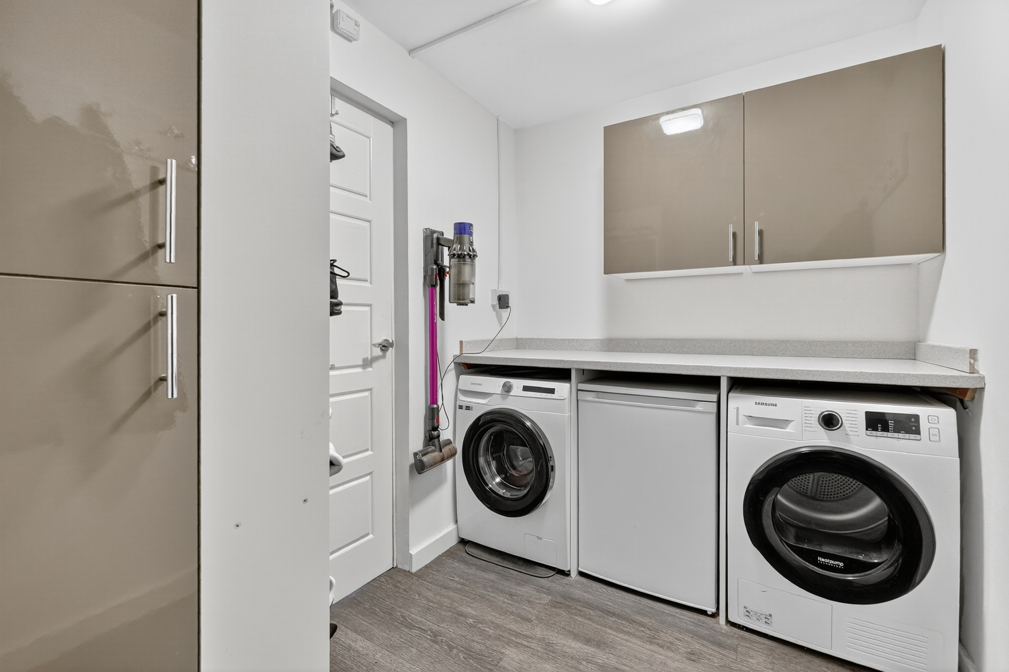 In more detail, the internal accommodation extends to an entrance hallway with stairs leading to the upper floor, a spacious lounge with under stairs storage, an extended dining kitchen, with Velux windows, ample wall and base units and luxury fitted appliances, a rear hall with a door out to the side, a downstairs WC and a separate utility room. On the upper floor there is a master bedroom with fitted wardrobes and an en suite shower room, a separate family bathroom, a storage cupboard and loft access off the landing, and three further bedrooms.