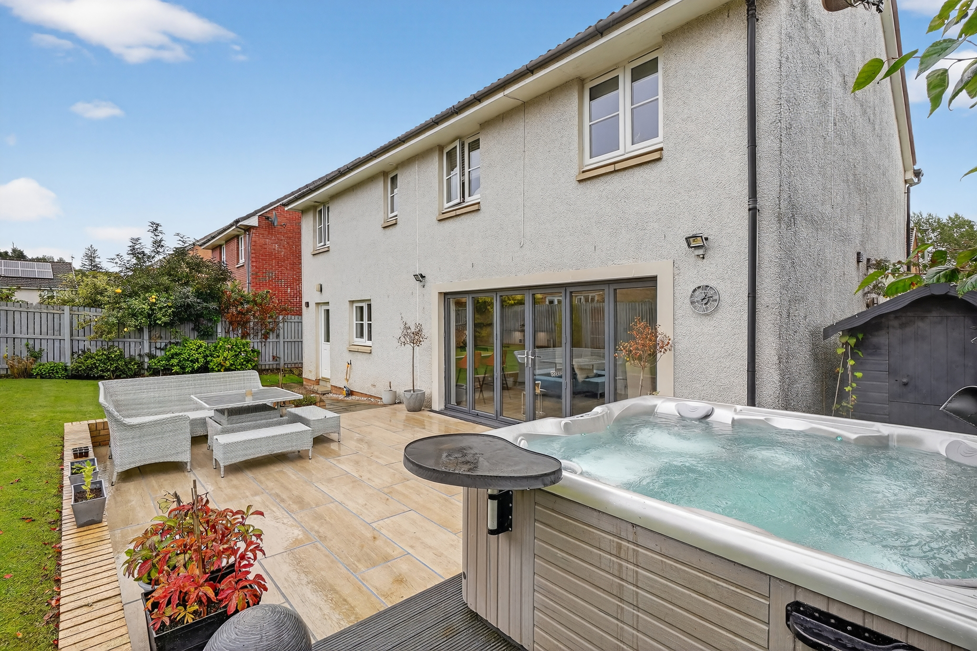 Externally the front garden is laid to lawn with block paved driveway parking culminating in the integral double garage with twin up and over doors. The fully enclosed rear garden is predominantly lawned with shrubbery borders and patio area with Porcelain tiling. The hot tub and two gardens shed will be included in the sale.