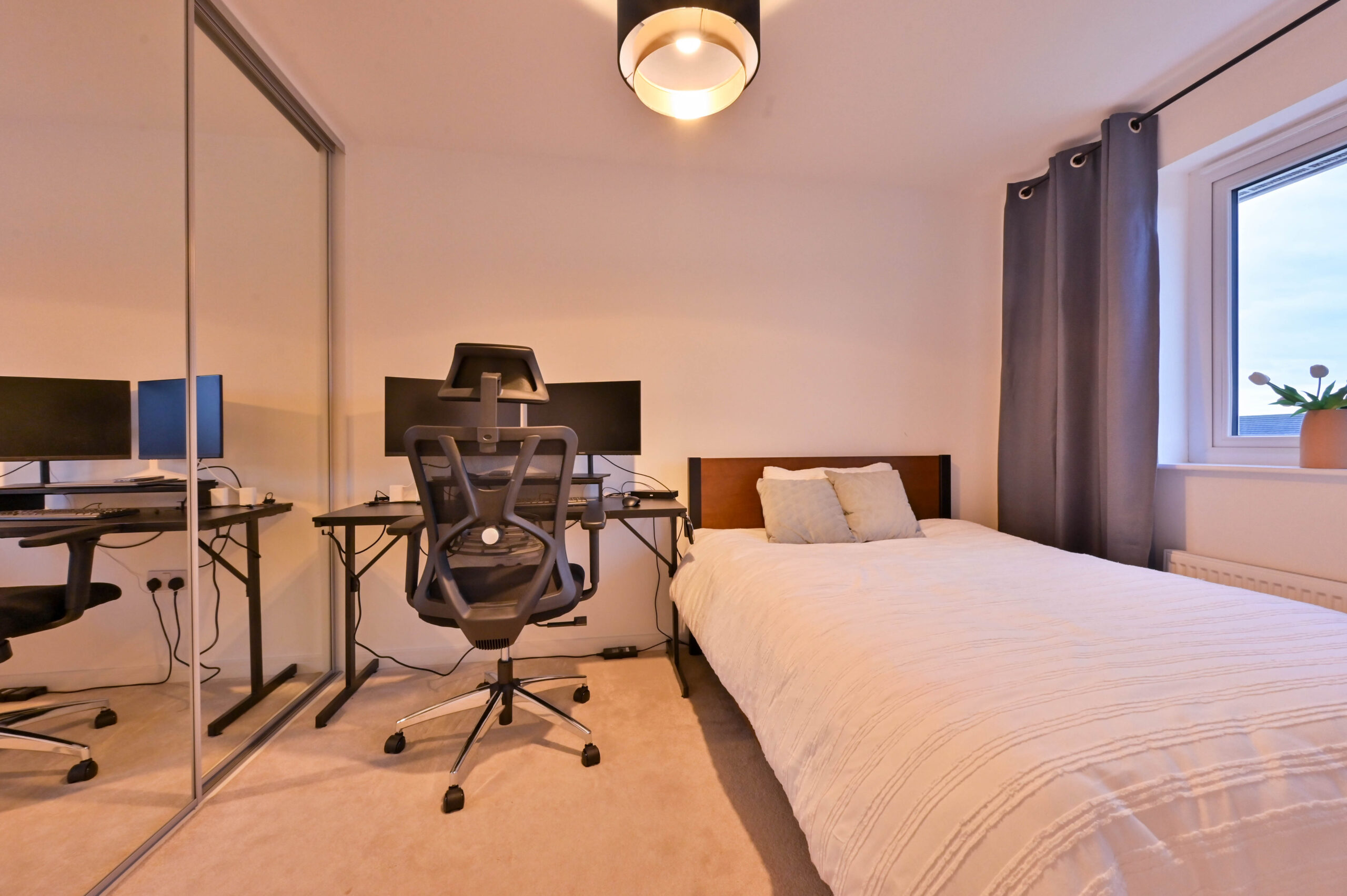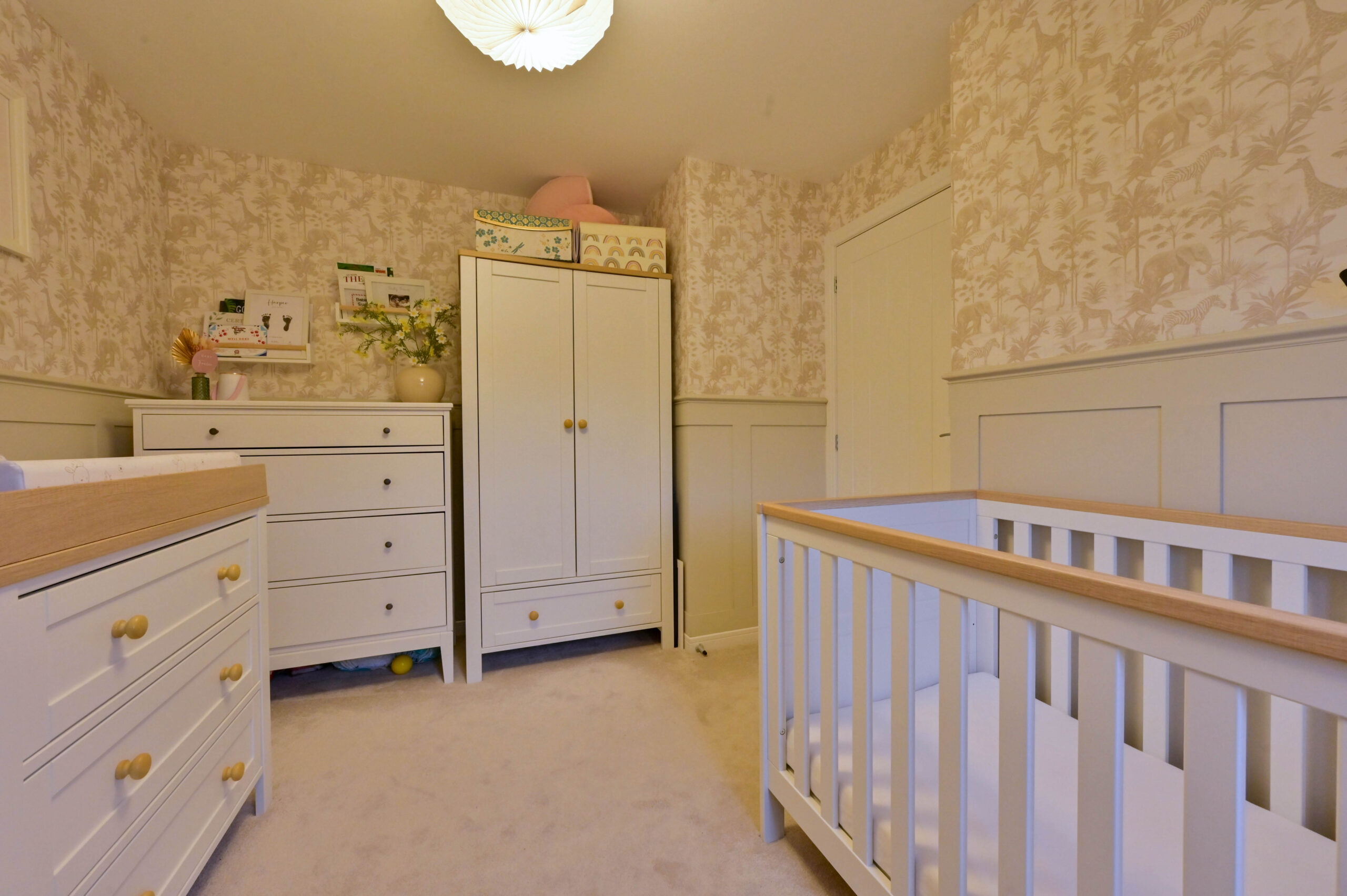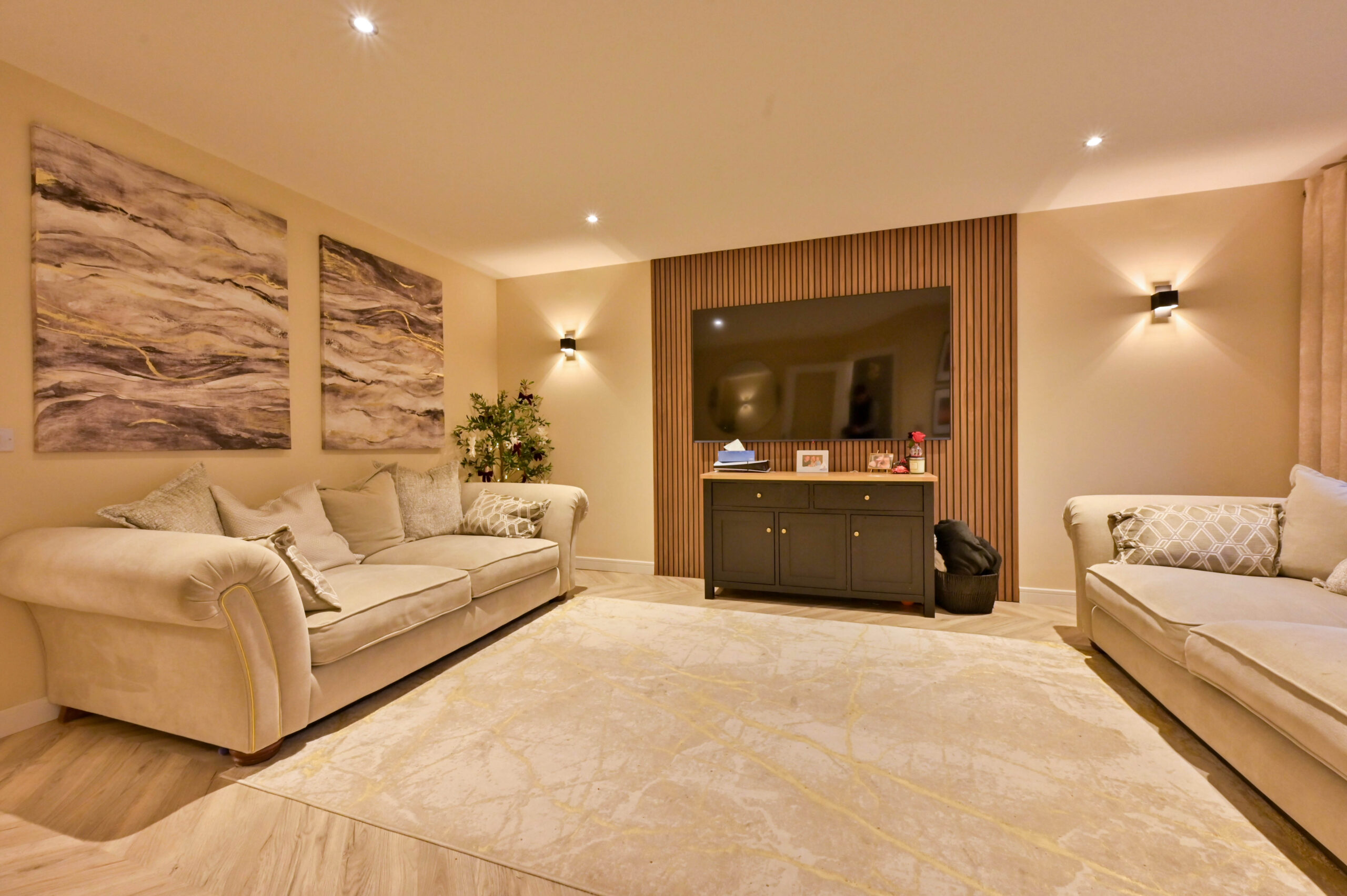Entry is via a welcoming entrance hall with a staircase leading to the upper level. To the front, the lounge is a bright and elegant space, featuring subtle spotlighting and a sophisticated panelled feature wall. The lovely rear kitchen-diner, fitted with a comprehensive range of base and wall-mounted units, integrated appliances, and a practical peninsula breakfast bar. A convenient under-stairs closet is located just off the dining area, while French doors provide seamless access to the rear garden. Completing the ground floor is a useful utility suite with base units and its own garden access, alongside a guest W.C. A significant bonus is the integrated garage, which has been expertly converted into an excellent additional reception room, currently utilised as a playroom.