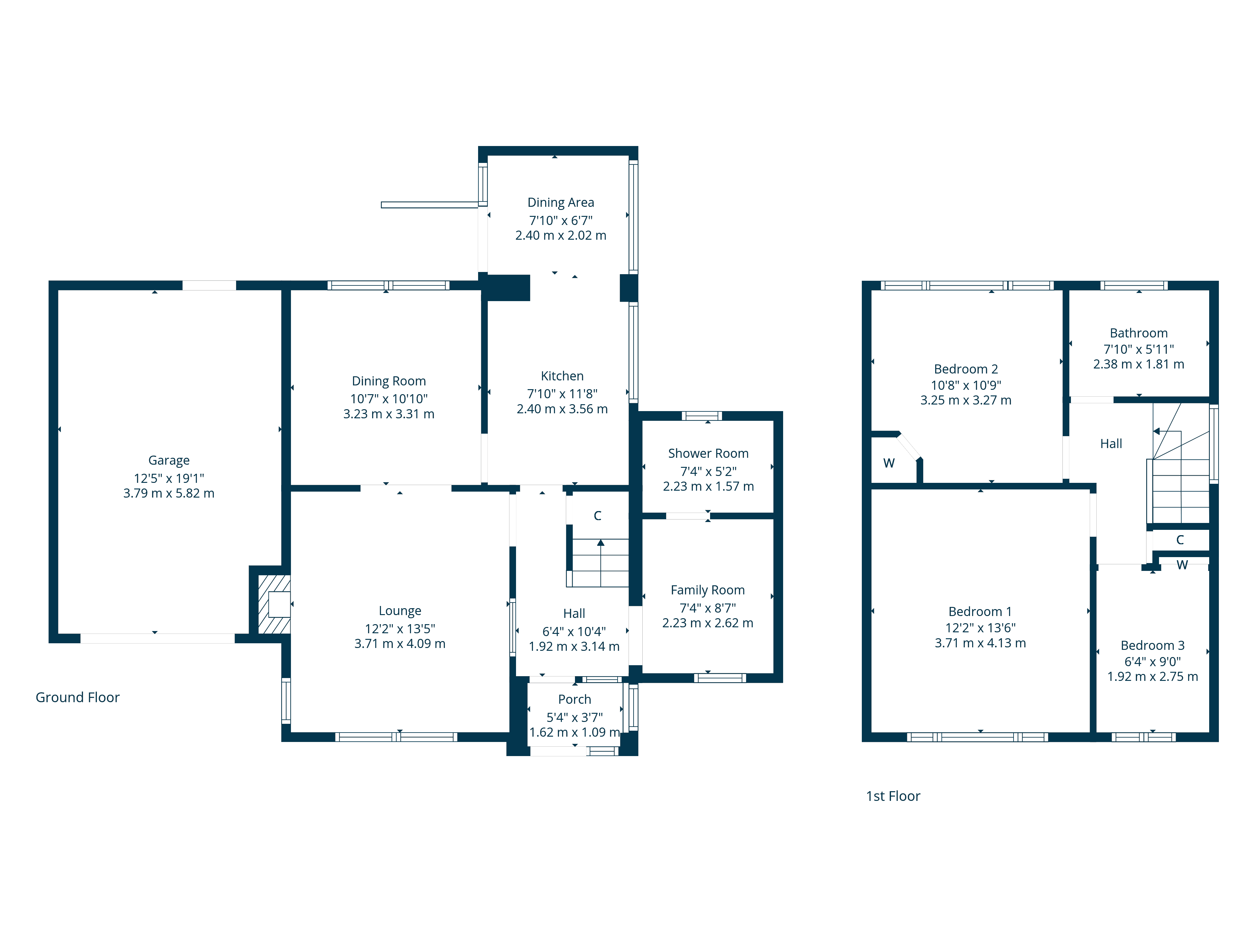 On the upper floor, the accommodation comprises three bedrooms. The principal bedroom is particularly spacious, while the remaining bedrooms are ideal for family use, guests or home working. A family bathroom completes the first-floor layout.