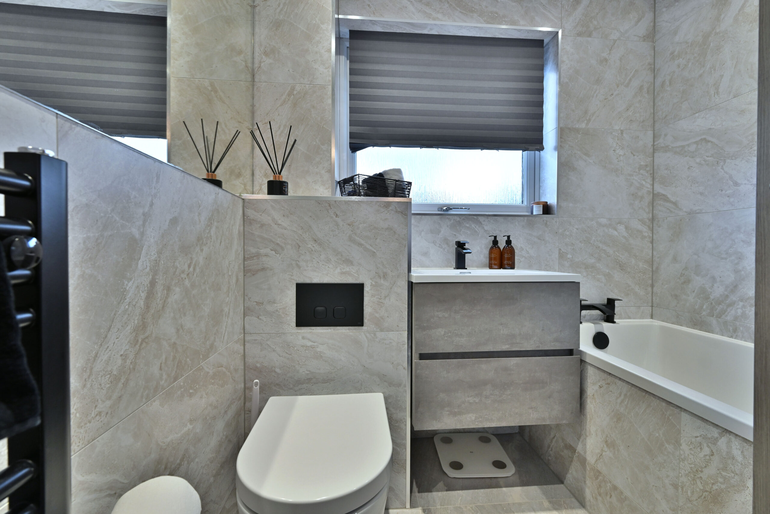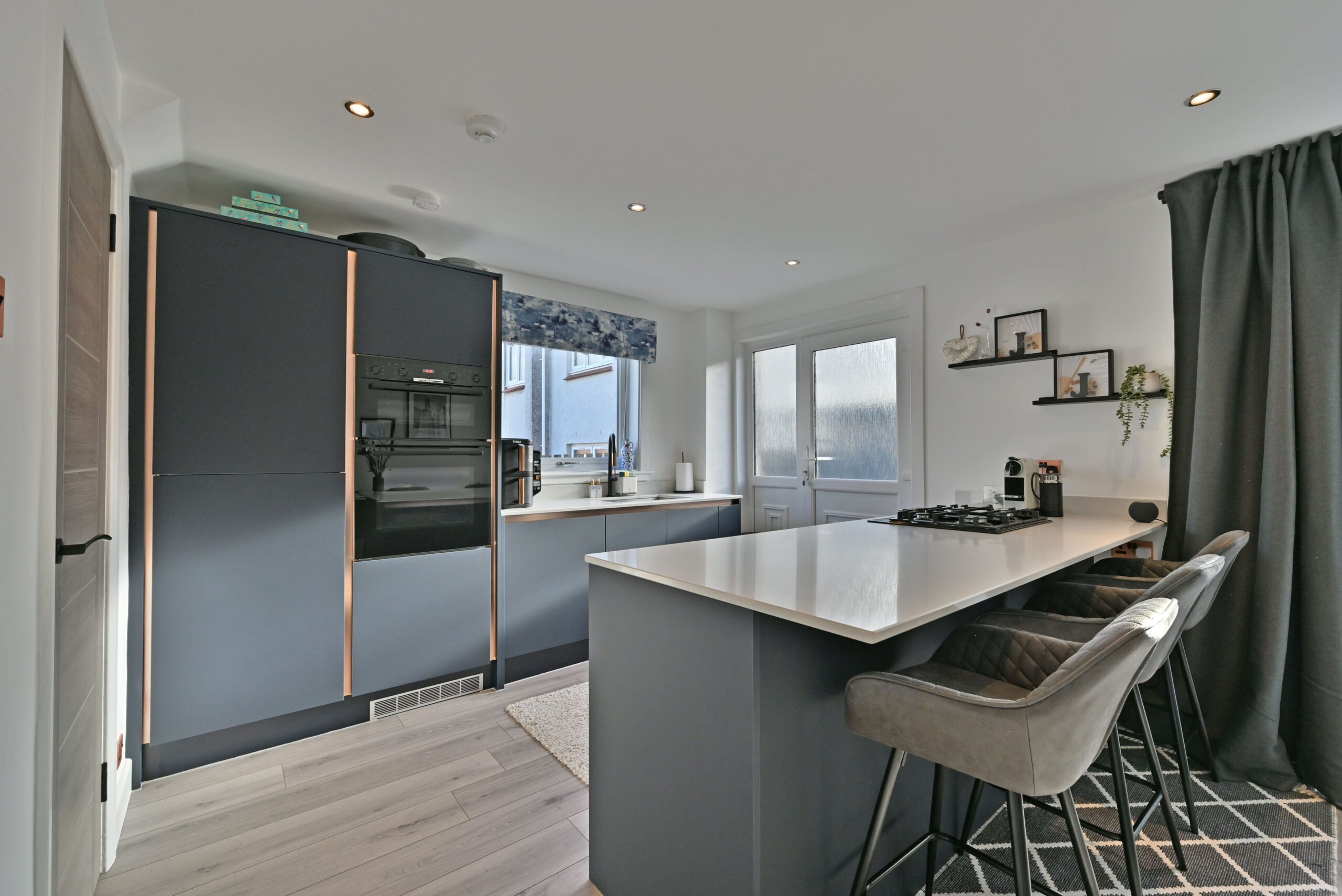 The accommodation comprises a reception hallway with a storage cupboard and a stairwell to the upper floor. The bright lounge has a large front-facing window and an open archway leading into the stylish, open-plan, dining-sized kitchen. There is a range of modern Wren fitted kitchen furniture with integrated appliances and French doors to the rear garden. A deep under-stair storage cupboard is utilised as a utility space. On the upper floor, there are three bedrooms and an elegant bathroom with modern sanitary ware and complementary tiling. The attic provides additional storage space.