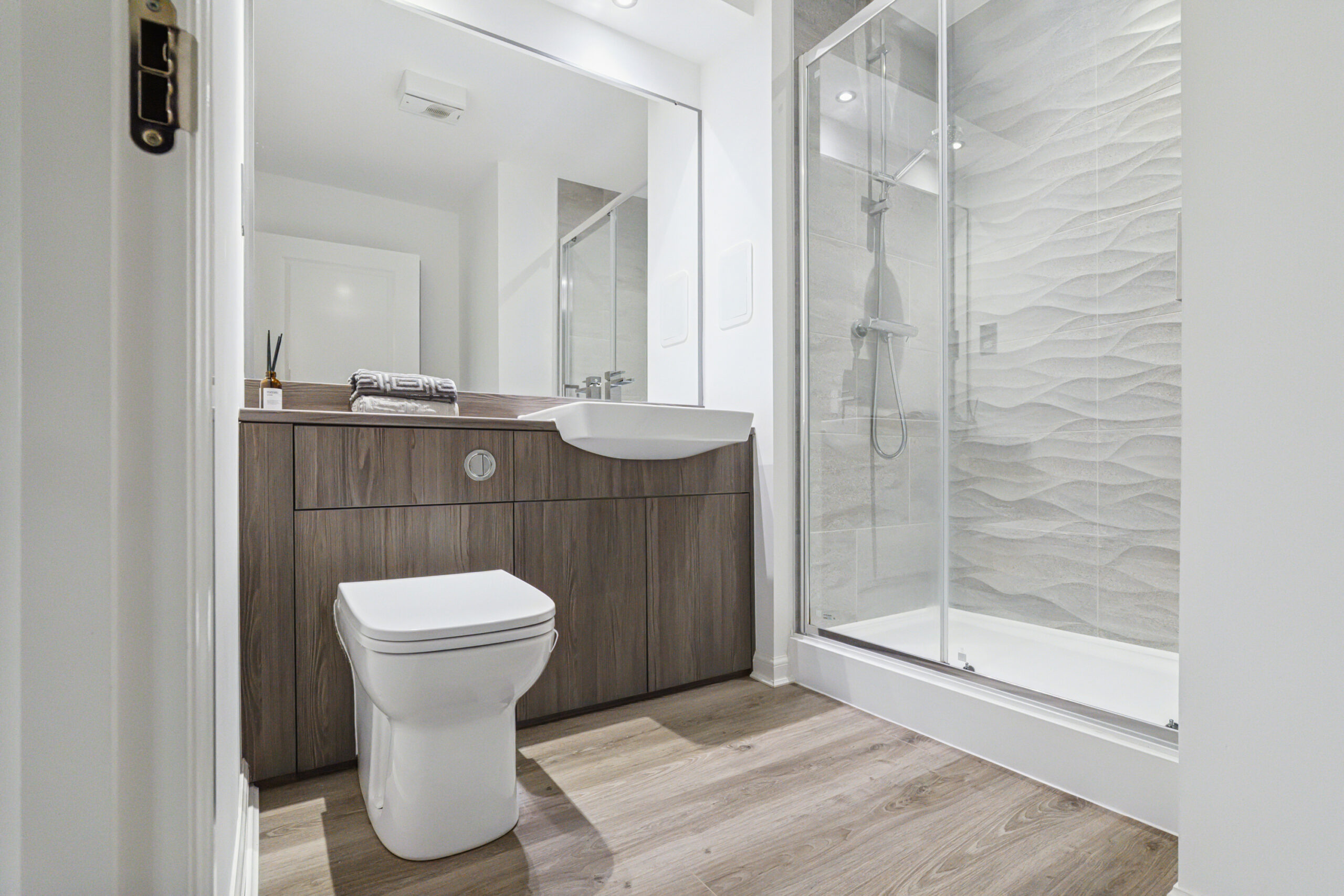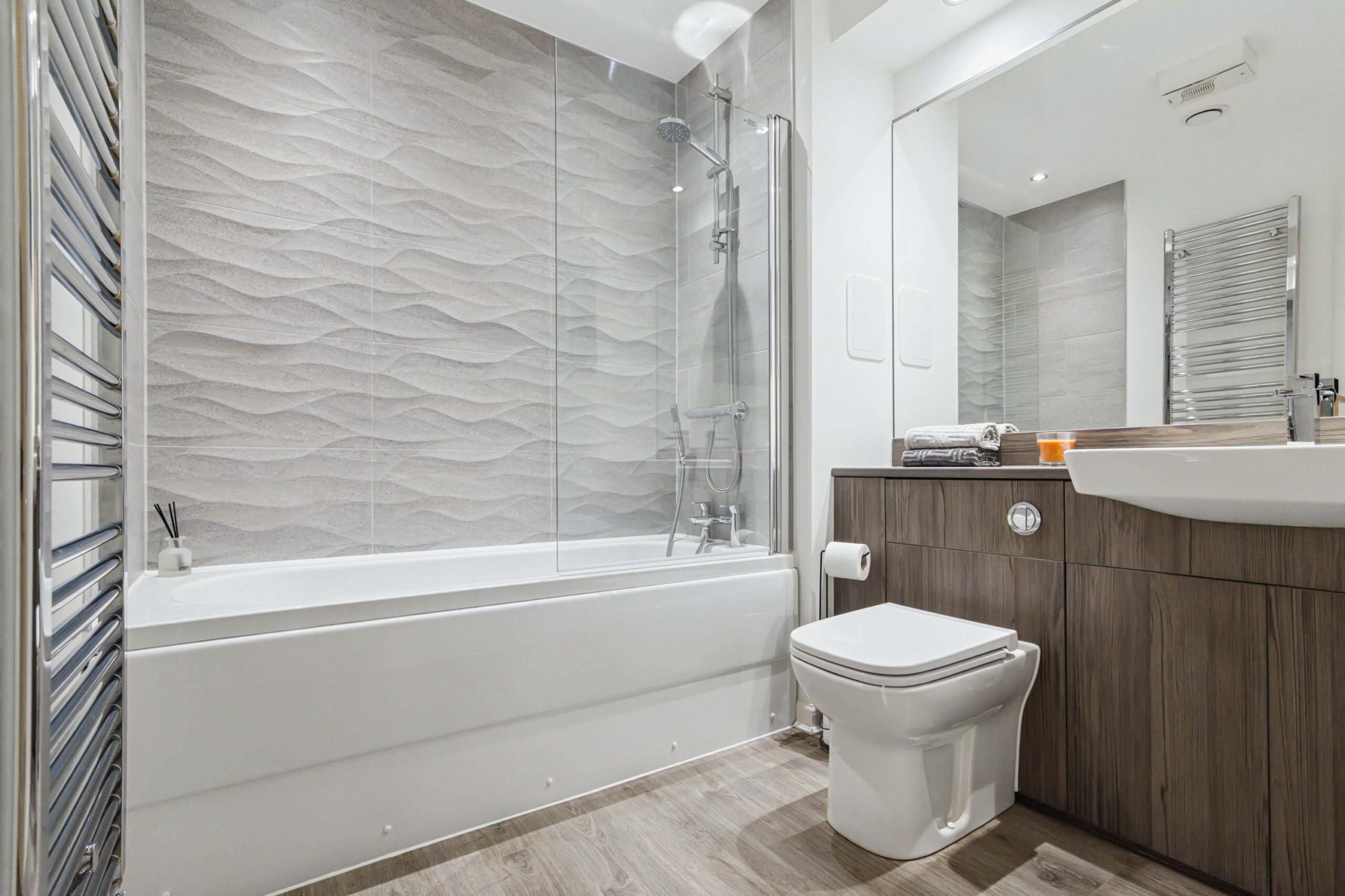 This apartment boasts a range of attractive features; the kitchen is equipped with fully integrated appliances for a seamless look, the main bathroom is fitted with a modern white suite, complemented by a practical wood effect vanity unit, and features a thermostatic shower over the bath. The thoughtful layout and high-quality fittings throughout create a welcoming and contemporary living environment.