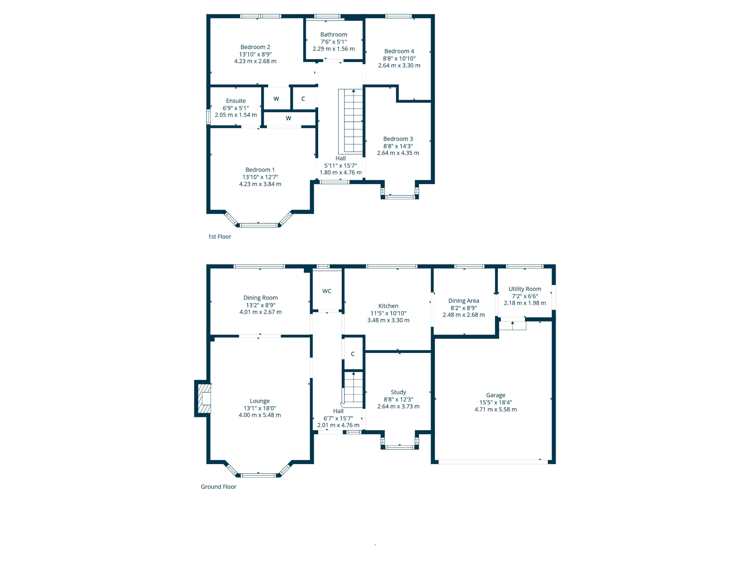 Upstairs, the principal bedroom is particularly spacious and features a bay window, fitted wardrobes and an en-suite shower room. A second generous double bedroom also benefits from integrated wardrobe storage, while two further well-proportioned bedrooms provide excellent space for children, guests or home working. A smartly appointed three-piece family bathroom completes the upper level.