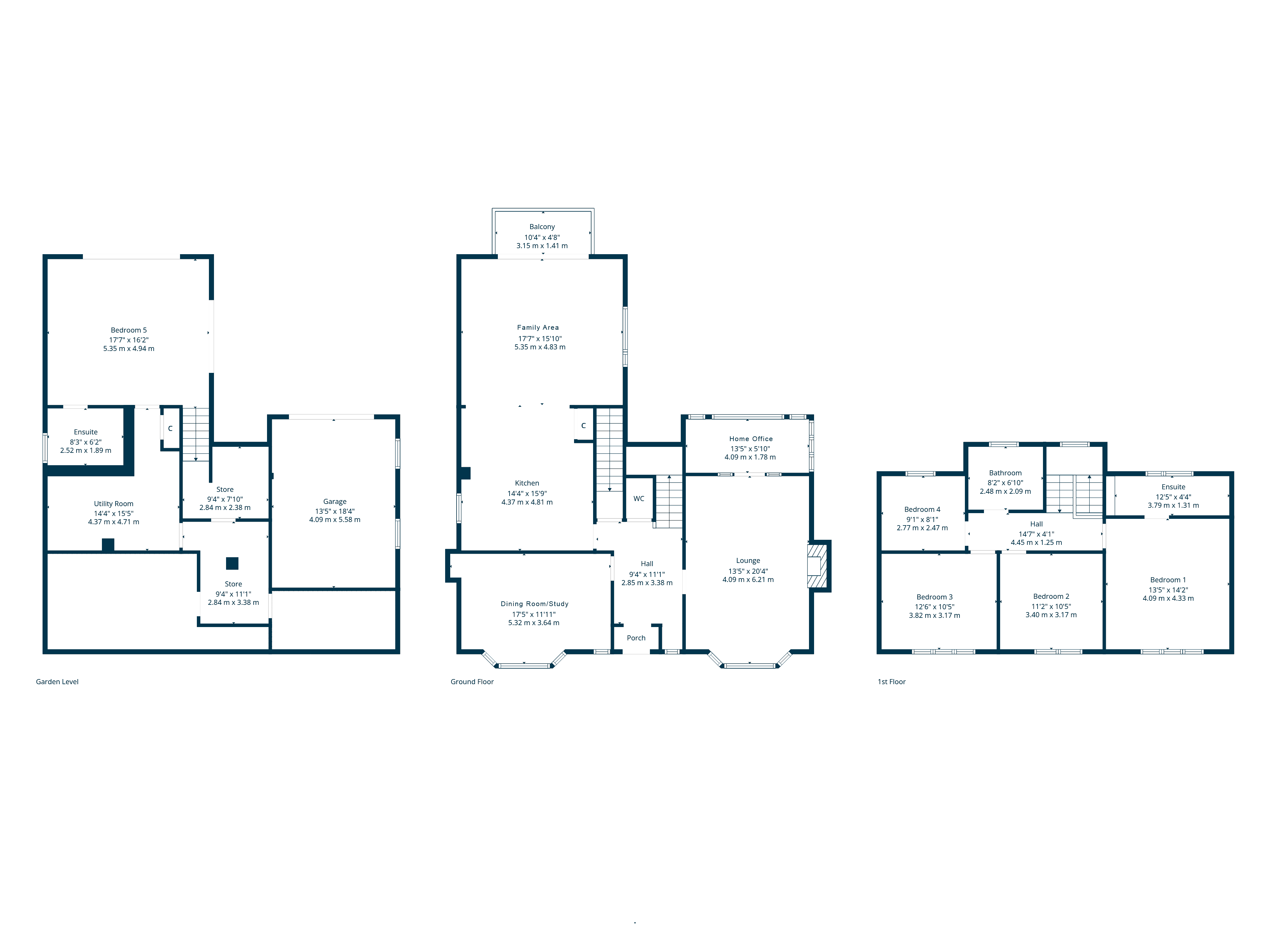 Double glazed door leading into vestibule, traditional style reception hallway with separate WC, cloakroom and under stair storage, dual aspect lounge with focal point open fireplace and double glazed doors leading through to a useful home office, bay windowed dining room to the front (currently used as a home office), rear facing kitchen with central island and built in appliances which is open to a dining/family area with double glazed doors giving access to south west facing balcony with open views. The lower ground floor accessed off the main hallway provides a large bedroom/garden room with double glazed patio doors and French doors to gardens, en-suite shower room/WC and there is also a large laundry/utility room with extensive built in storage and giving access to further cellar/basement storage space. The first floor leads to principal bedroom with extensive storage, feature double glazed bay window to front and its own en-suite shower room, three further bedrooms and a main family bathroom with roll top bath, separate shower and modern tiling.
