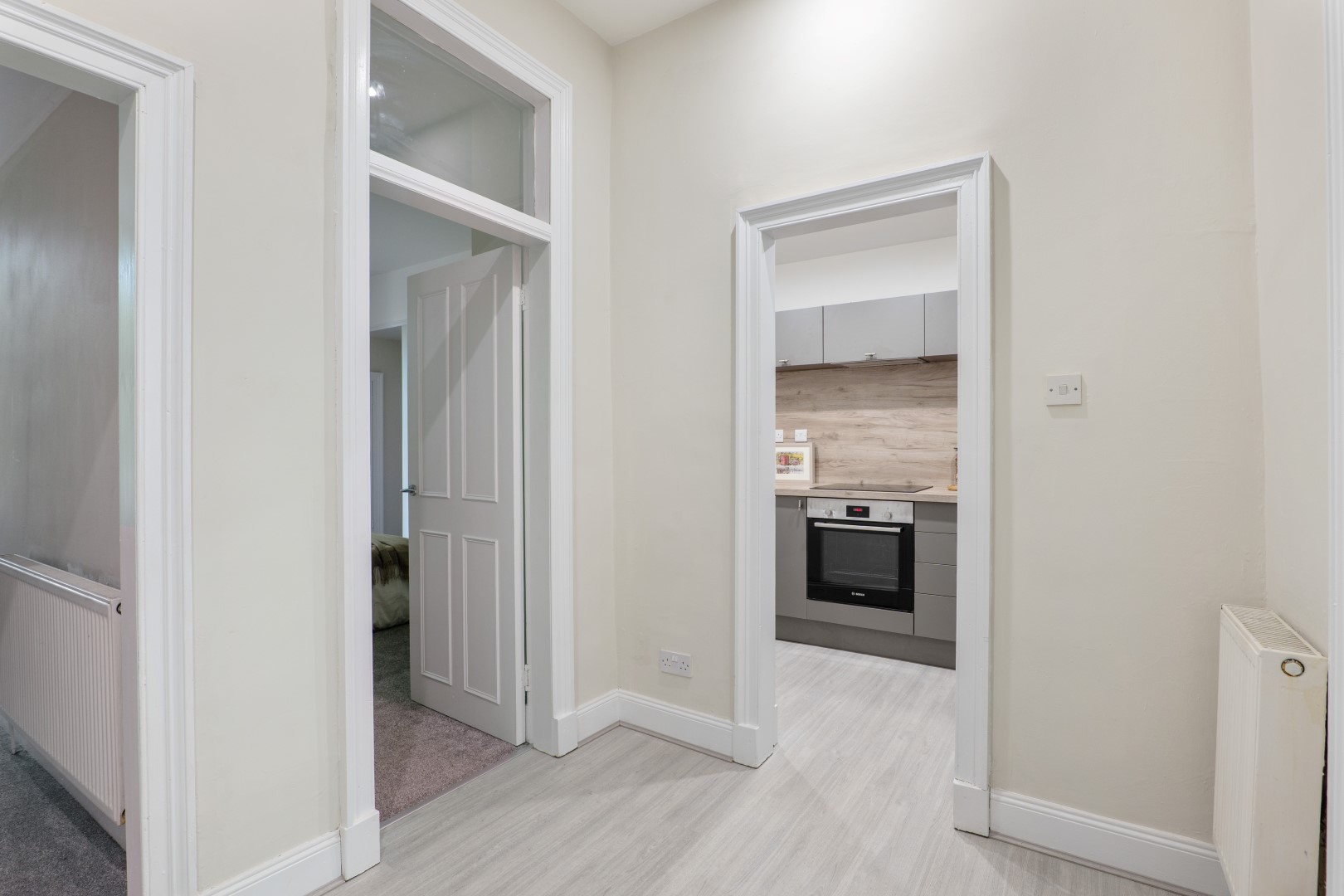 The property has been thoughtfully upgraded by the current owner and is presented in excellent condition throughout. Access is via a secure entry system, leading into a well-maintained communal hallway. A traditional storm door opens into a bright and welcoming reception hallway, complete with a generous storage cupboard.
