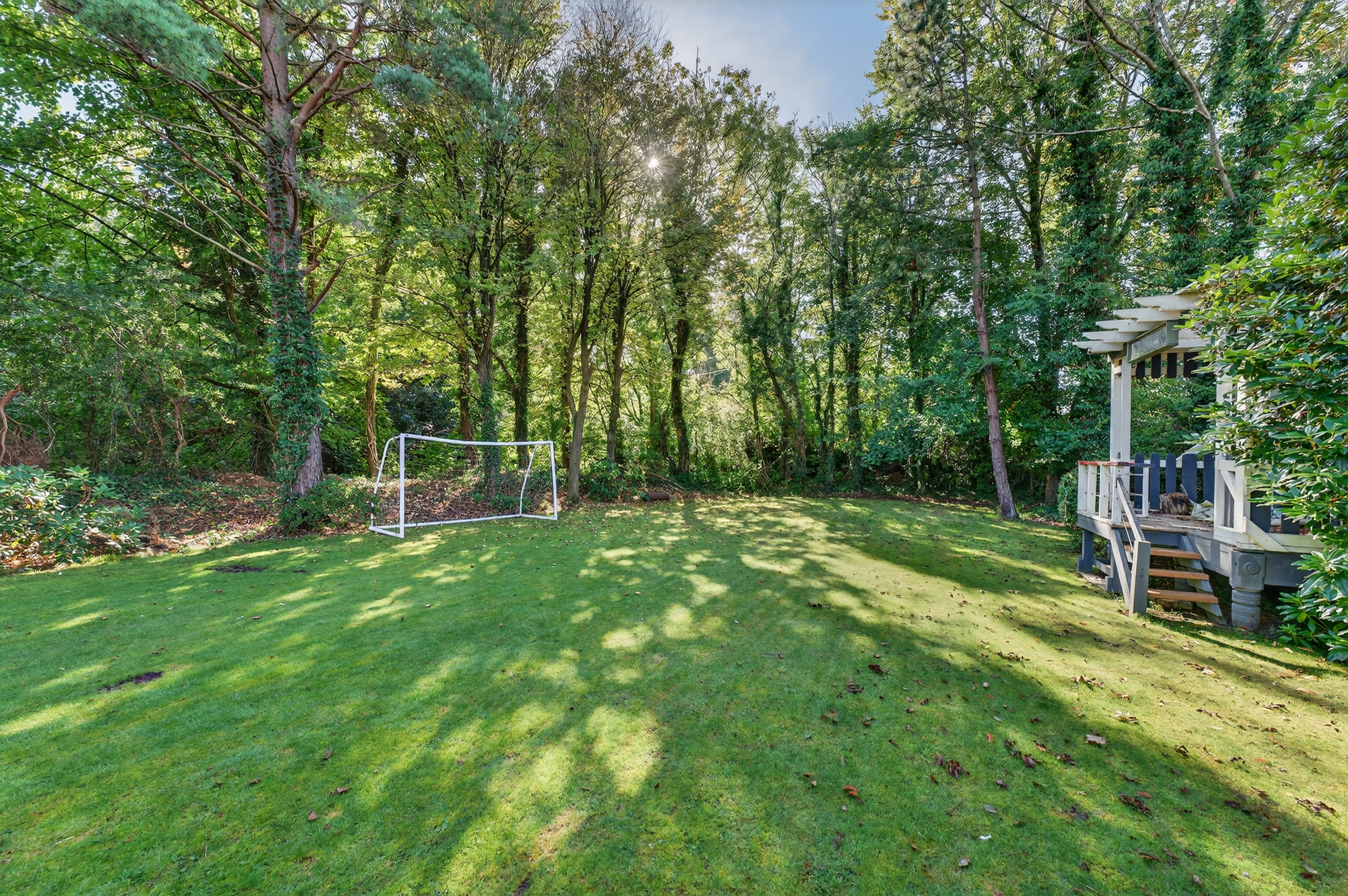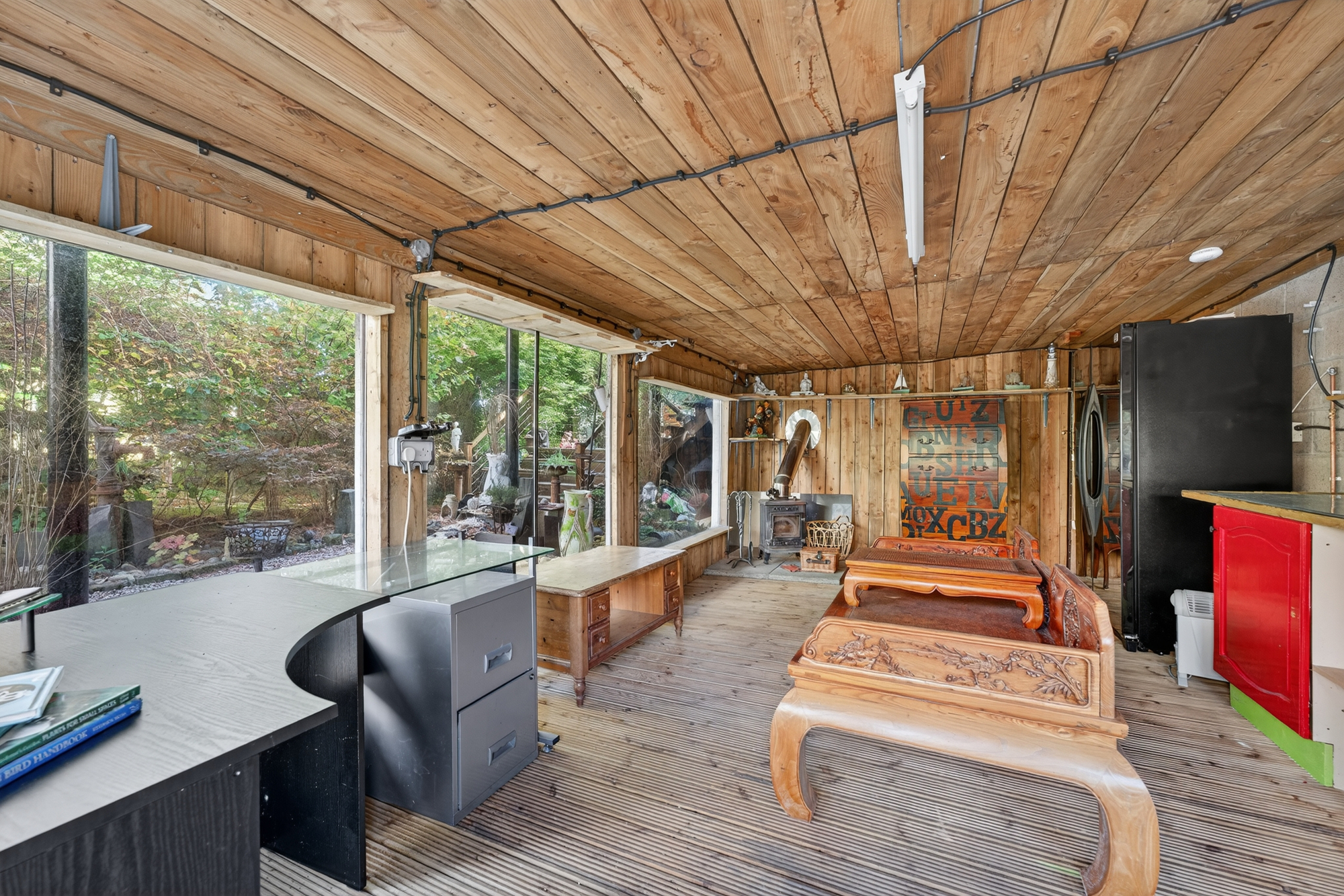 The property enjoys a gated driveway laid with decorative gravel, leading to a manicured front lawn framed by mature specimen trees and hedging that provide privacy and shelter. To the side is a low-maintenance garden space, while the rear features a stunning Japanese-inspired courtyard garden complete with pond, water feature, and a variety of shrubs and plants. The detached garage at the rear has two timber double doors, a WC, and an upper-level games room with its own balcony that connects to the outdoor terrace and kitchen area. The elevated deck provides breathtaking views over the Annick Water, enhancing the home’s serene, countryside feel.