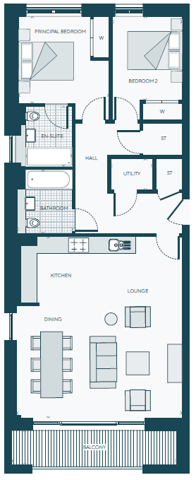 A substantial Type A apartment extending to 946 sqft with additional full width covered outside terrace.  Superb open plan public space and  2 excellent West facing bedrooms to the rear onto landscaped residents gardens.