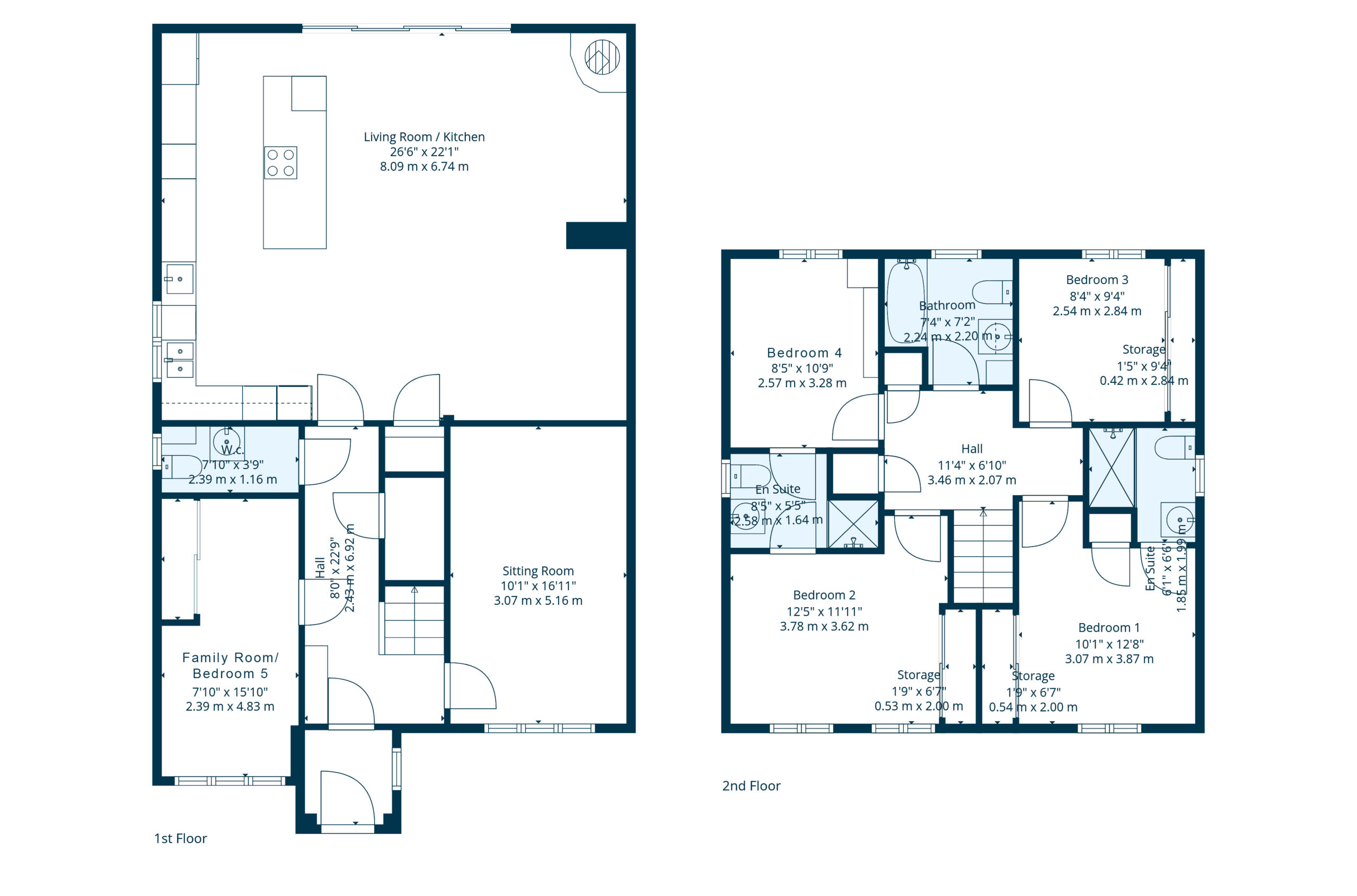 The upper level offers a principal suite with bespoke fitted wardrobes and a stylish en-suite shower room. Bedroom two and three share a Jack and Jill en-suite, also benefitting from built-in storage. The remaining bedroom is well-proportioned, with fitted storage and a spacious three-piece family bathroom. The fourth bedroom is currently utilised as a home office with bespoke storage solutions.