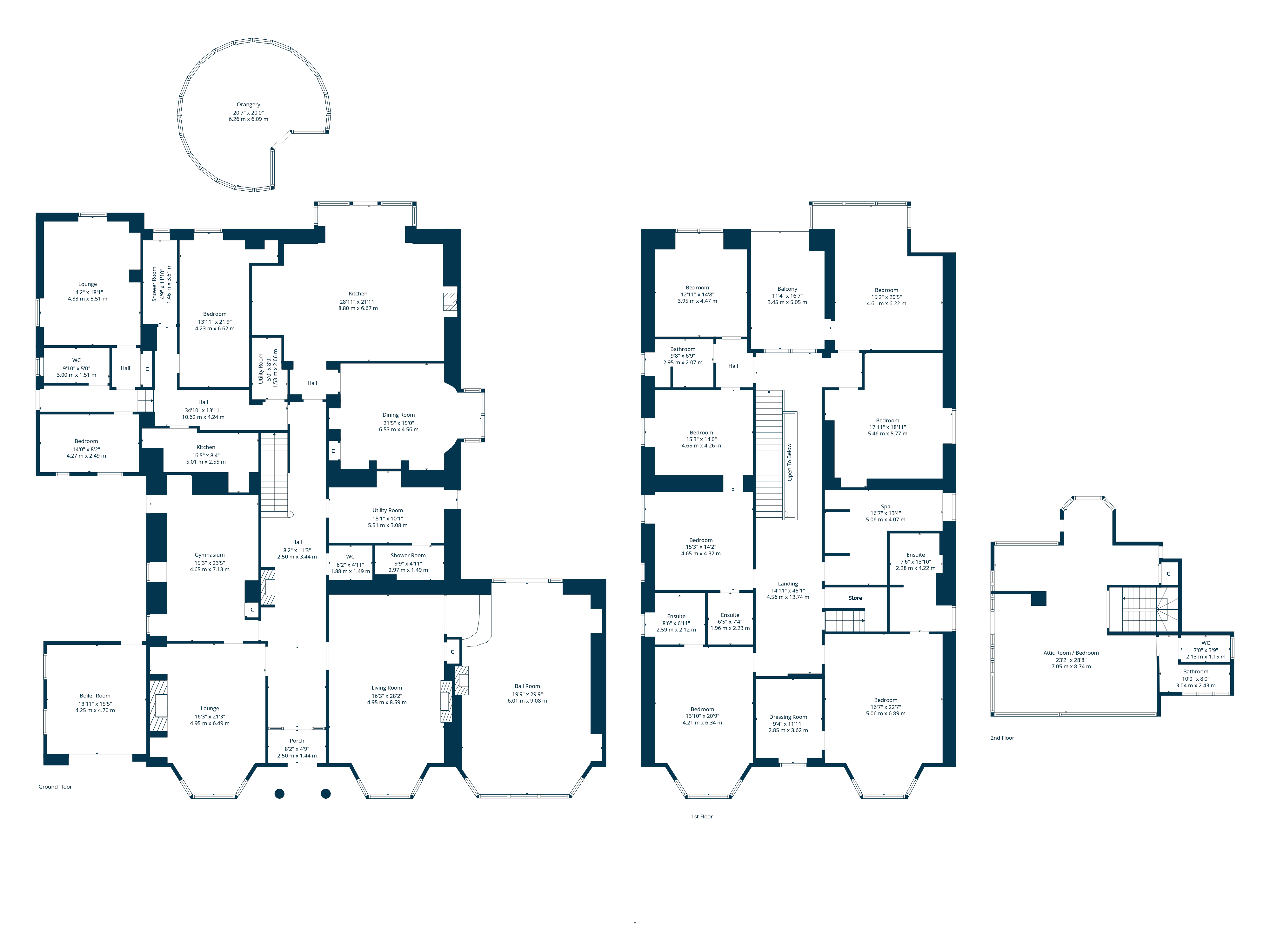 The original staircase in the main house leads from the ground floor hallway to a spectacular first floor landing revealing seven double bedrooms, two of which have bay window formations. The principal bedroom has a designated dressing room and a luxurious en-suite shower room whilst there are two other en-suites, one with a bath, one with a shower. There are then two bathrooms accessed from the landing, one three piece and one a four-piece sumptuous spa complete with jacuzzi bath and a chromotherapy shower enclosure. One of the rear bedrooms also has a door leading out to a South facing balcony.