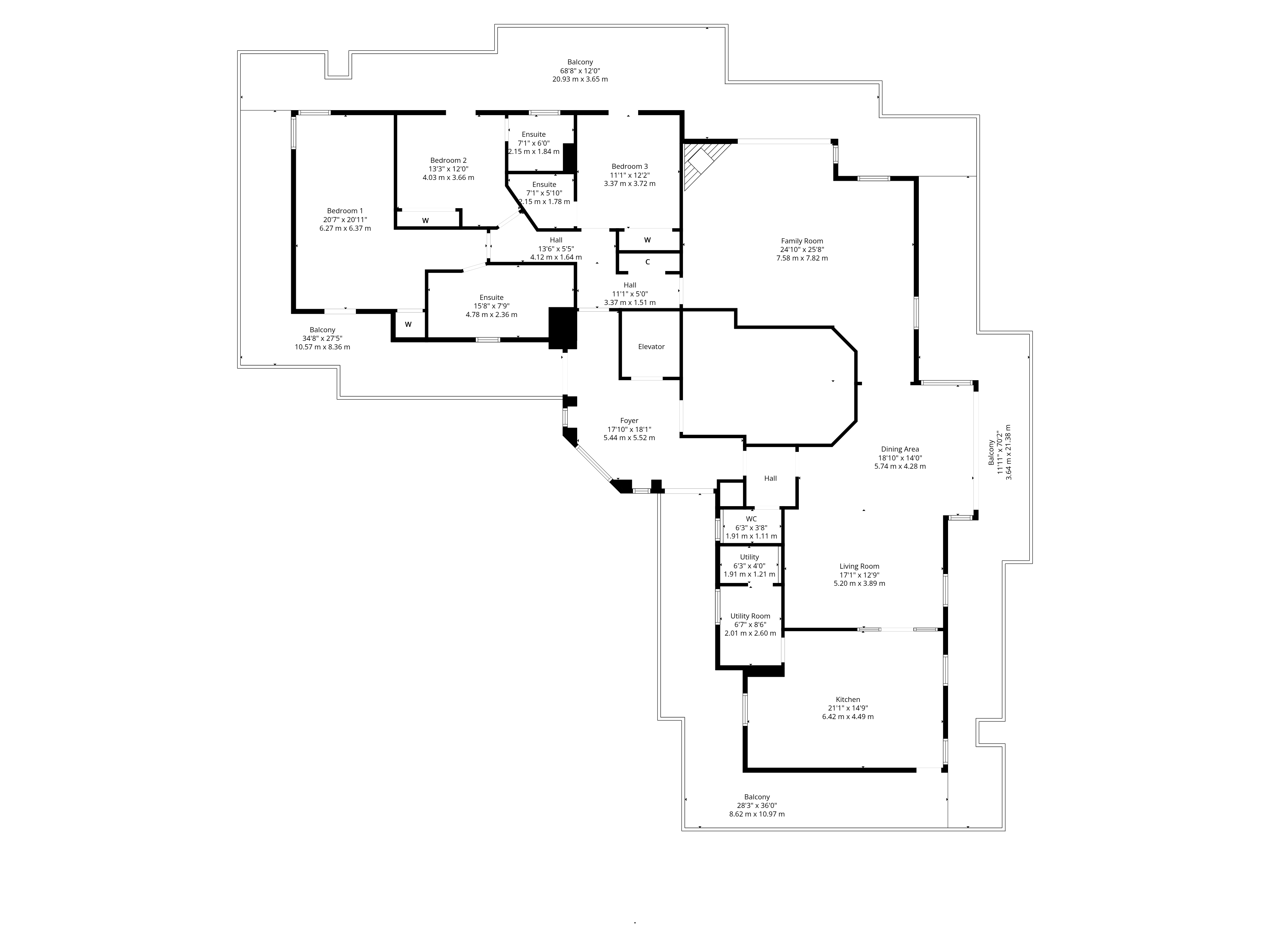 The accommodation is exceptionally generous and beautifully balanced. From secure entry at ground level, a private lift access leads to the top-floor lobby, exclusive to this apartment. From the lobby, there is direct access to the roof terrace and two separate entrances into the apartment itself. Internally, the layout comprises an extremely bright and expansive lounge, with formal dining area, a substantial second family room or sitting room, and a well-equipped contemporary dining kitchen, fitted with quality cabinetry and a full complement of integrated appliances, with a separate utility room positioned off. There are three impressive double bedrooms, each benefitting from fitted storage and en-suite shower rooms. The principal bedroom is of extremely generous proportion and boasts a large and well-appointed four-piece ensuite.
