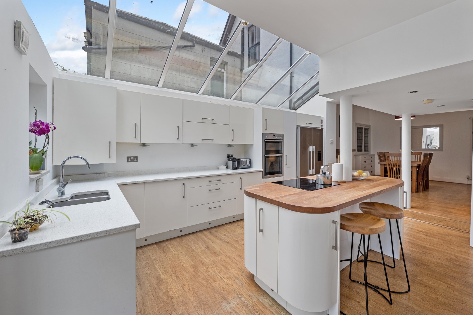 At the rear of the property, a striking open-plan kitchen and dining area forms the heart of the home. Designed with both function and style in mind, this space features a stunning half-glass roof and full-height glazing, flooding the room with sunlight and creating an uplifting sense of openness. The kitchen is sleek and modern, with ample space for dining and entertaining, and opens directly onto a beautifully maintained south-westerly garden — a true suntrap, that is ideal for outdoor living.
