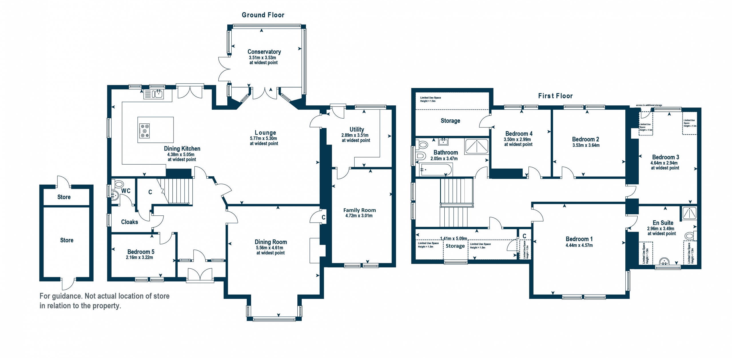 Entry to the home via twin storm doors into a charming vestibule, then into a welcoming, timber-panelled reception hallway. There’s a handy cloakroom with WC and under-stair storage. From the open-plan lounge area, a fitted utility room leads through to a versatile family room (currently set up as a playroom, it could be a gym, cinema, or whatever suits). On the ground floor you’ll also find a fifth bedroom, ideal for a study/home office.